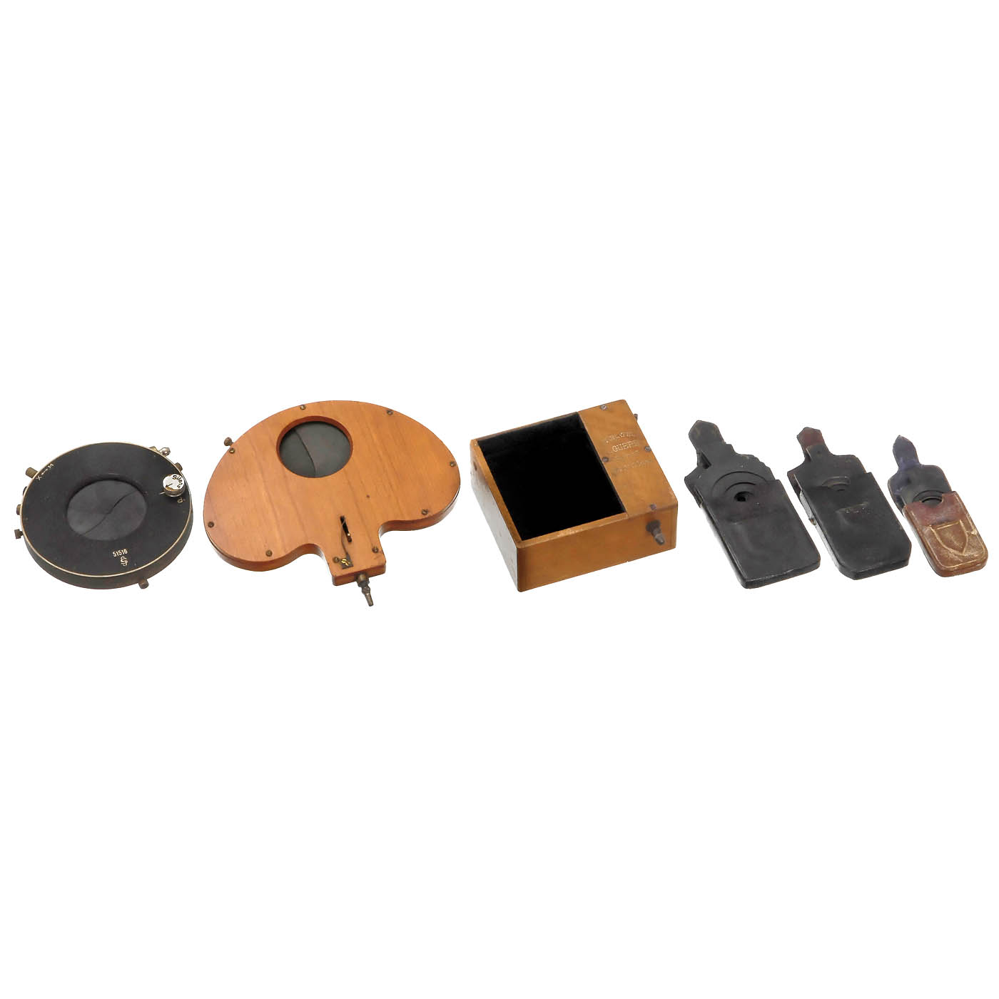 1) Hermagis, Paris. No. 22994, landscape lens f 35 cm, with 3 stops, cap and ring. – 2) Darlot, Paris. Landscape lens f 28 cm, with near-matching screw-ring. – 3) Chevalier Fab.T., Paris. Landscape lens f 21 cm, with iris and cap. – 4) Derogy, Paris. Tele-lens with matching Aplanat No. 3 positive element, height 17 cm, with cap and ring. – 5) Rodenstock. Bistigmat 13 x 18 cm, rotating shutter with revolving stops and ring. – 6–8) 3 shutters: early shutter for Ø 59 mm lenses, small Guerry flap shutter and Silens shutter for Ø 57 mm. – And: 9–11) 3 sets of Waterhouse stops for widths of 48 mm, 43.5 mm and 31 mm, with cases.