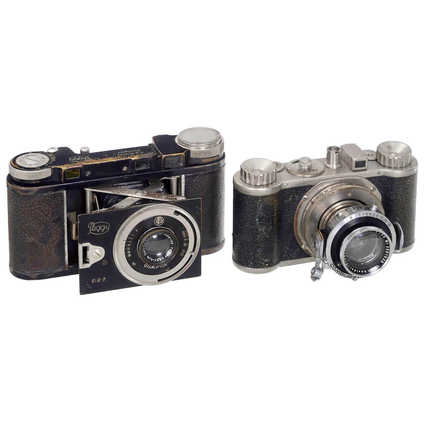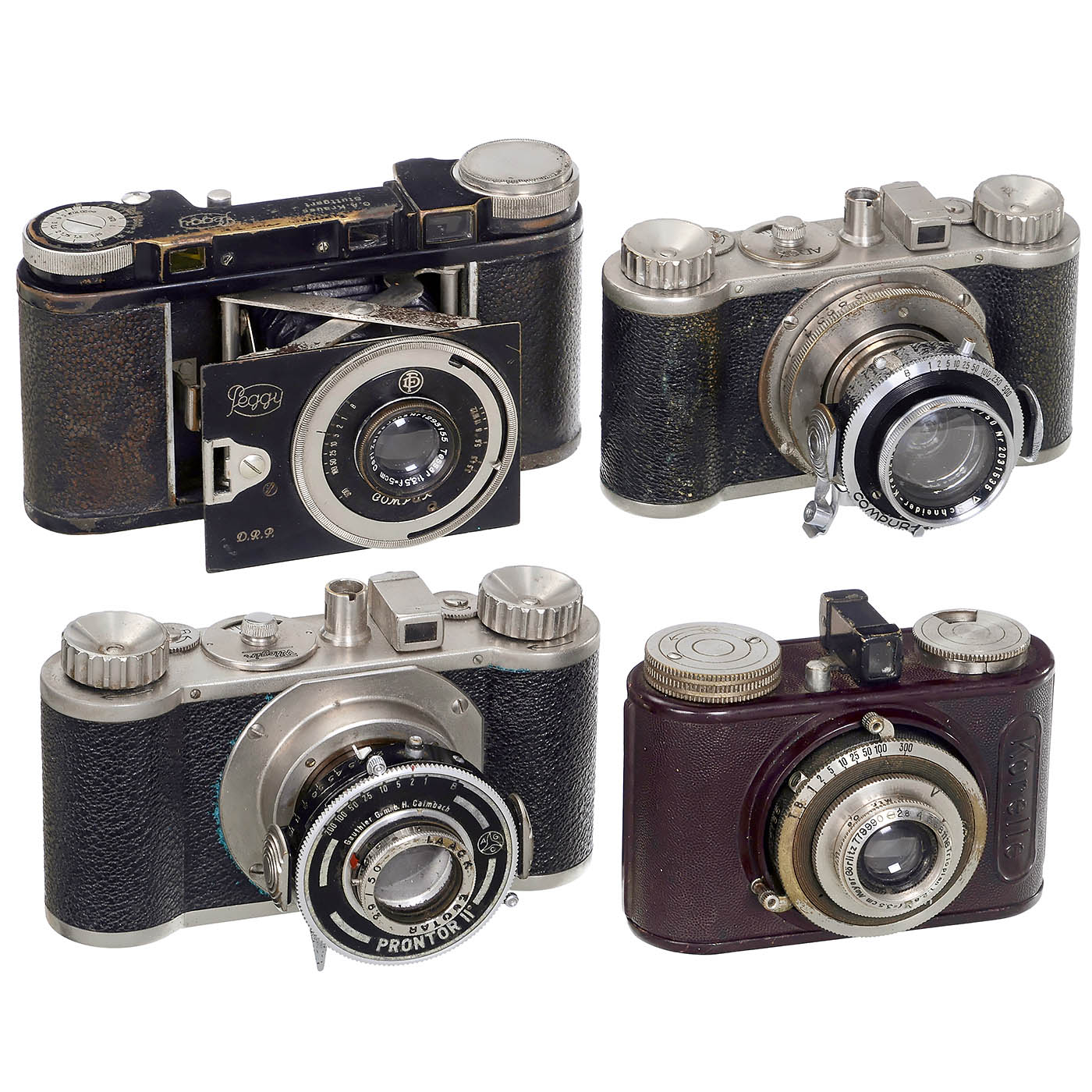 1) Krauss, Stuttgart. Peggy II, no. E202/2, with 2 cassettes, Zeiss Tessar 3.5/5 cm no. 1293155, shutter inoperative, secret compartment empty. (4/4) – 2) Wirgin, Wiesbaden. "Adox" with helical focusing and Schneider Xenon 2/50 mm no. 2031535, front lens with small chip, shutter stiff. (3-/4) – 3) Edinex with Laack Egotar 2.9/50 mm, shutter stiff. (3-/3-) – And: 4) Kochmann, Dresden. Korelle K, russet plastic, Meyer Trioplan 2.8/ 3.5 cm, shutter inoperative. (3-/–)
