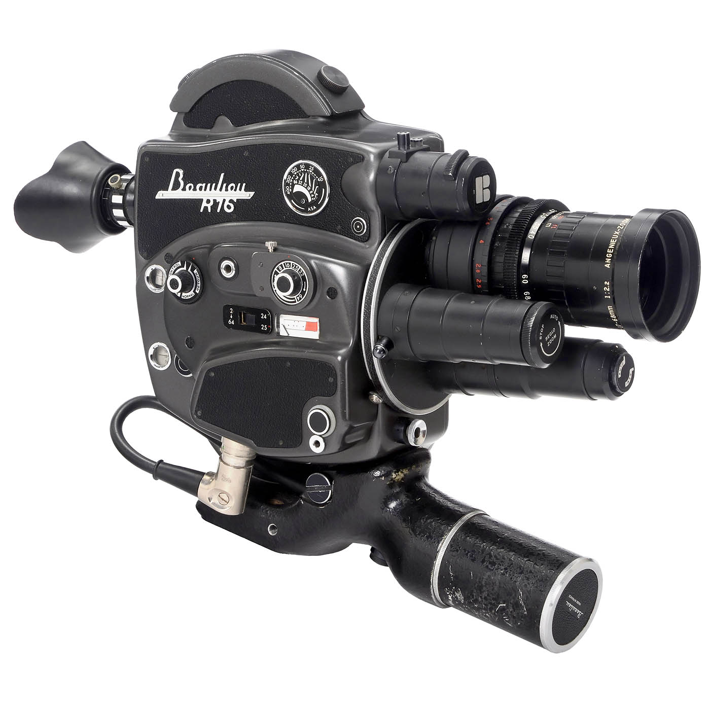 Beaulieu, Paris. For 16mm film on 30-meter spools, with electric motor 2–64 frames/sec., automatic exposure, connection for 60-meter cassette (not included), an Angenieux zoom 2.2/17–68 mm lens, rechargeable batteries, charger and carrying case, electrical functions not checked. – The R16 was used for television productions for many decades, the quartz-controlled motor enabling synchronous recordings with tape recorders.