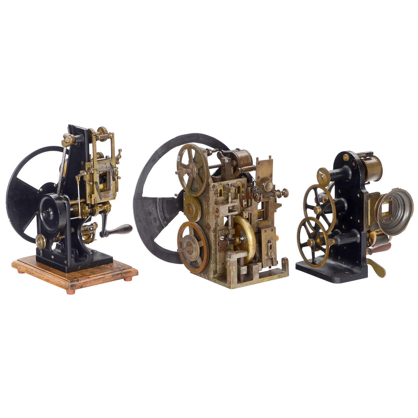 Manufacturer unknown, two with Maltese cross transport mechanisms, one with rare film-stepper mechanism with beater movement. – Note: From the early days of cinematography in Europe; from around 1910 only steel was used for moving parts due to wear and tear, not brass as in these designs. – In addition: 2 projection lenses. – Rare and sought-after projection heads!