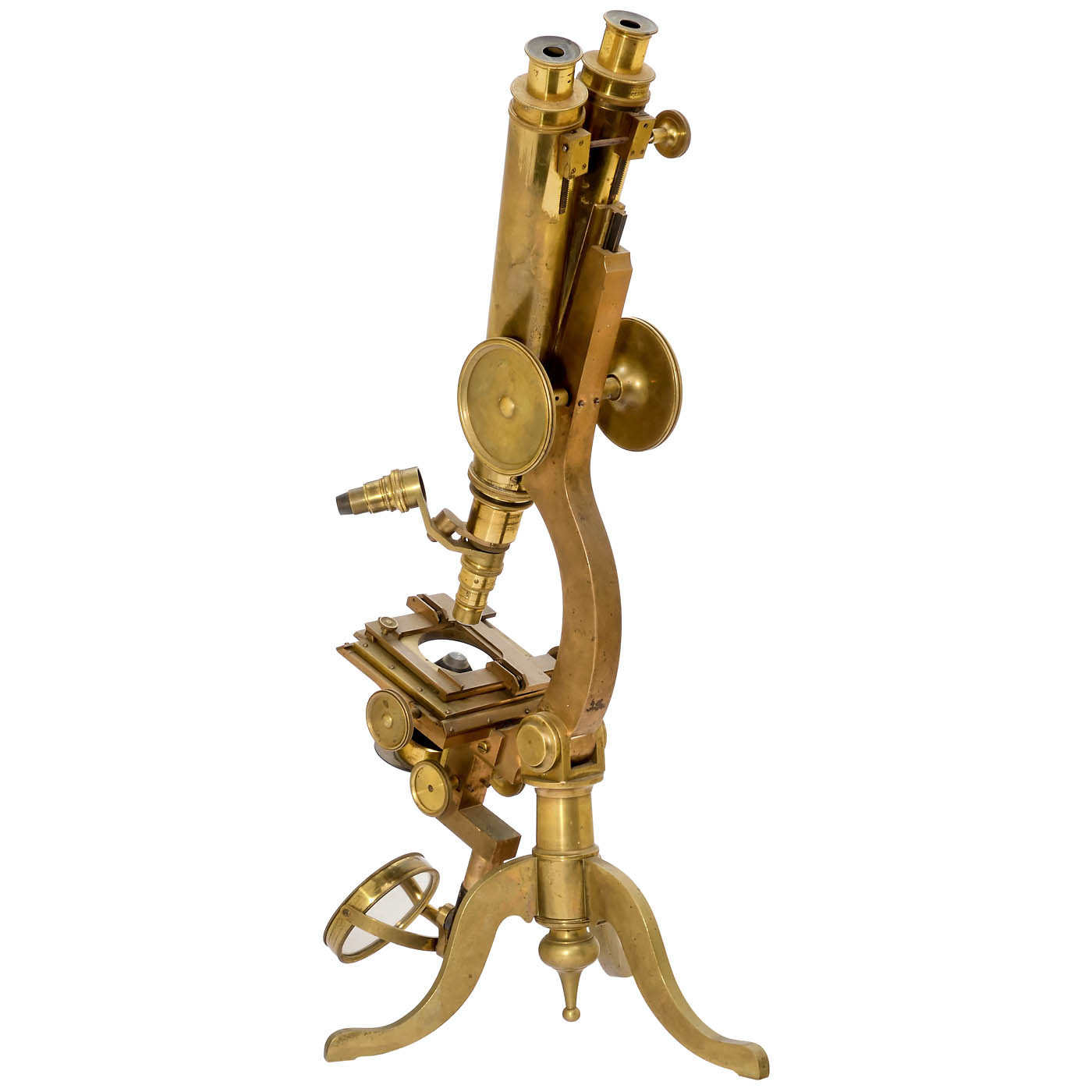 Unsigned, brass, tilting stand, coarse and fine focusing, rotating stage, double mirror, height-adjustable condenser and pinhole diaphragm, 1 pair of eyepieces, 2 objective lenses in turret (one marked "Powell & Lealand"), tube with prism, closed height 23 in., milled head screws somewhat loose. A very rare model with clear optics.