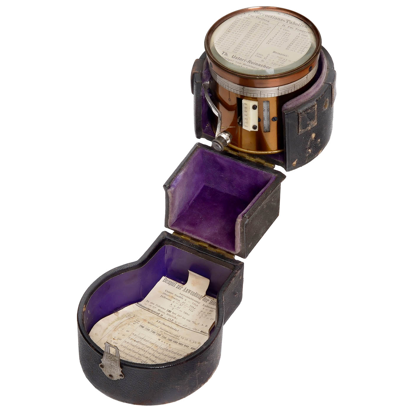 1) Circular goniometer, c. 1930, Salmoiraghi, Milan, steel, with accessories in box. – 2) Box bussole, brass, length 7 in. – 3) 2 early plane table alidades, c. 1830, brass, with sight vanes and object vanes, one with plumb and angle scale. – 4) Pocket protractor, c. 1880, "Patentiertes Tascheninstrument zum Nivellieren und Winkelmessen" (Patented pocket instrument for levelling and angle measurement), brass, optics with cardanic suspension, rotating scale, height with handle only 4 ½ in. – 5) English sector, boxwood, circular brass hinge, with several scales. – 6) 5 four-fold boxwood rules, each with brass arch joint at the center and two brass hinges, divided in inches. – 7) Caliper, England, boxwood and brass. – 8) Plane table alidade, Germany, lacquered and oxidized brass, telescope with rack-and-pinion focussing, length 15 ¾ in., dust cap, silver scales, one bubble level, clear optics. – 9) Spherical cross, original lacquered brass, 7 in. high. – 10) Protractor, made by Keinath, Tübingen, Germany, brass, with 2 diopters and plummet. – And: 11) Pocket aneroid barometer, Switzerland, late 19th century, marked "Th. Usteri-Reinacher, Zürich, N. 3541", lacquered brass, with readout magnifier, lateral thermometer and rotating top with correction parameters table, contained in shaped pebbled-leather covered case.