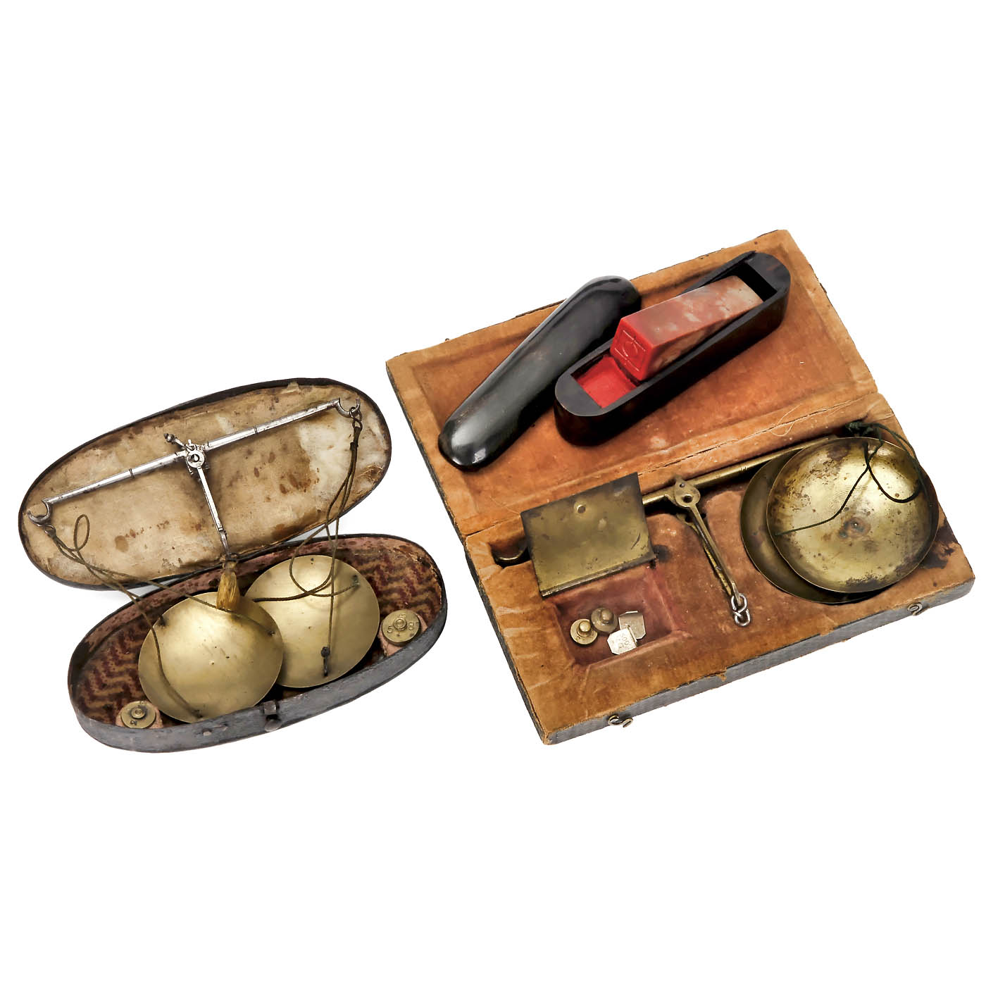 1) Hand scale, marked "Fine Apothecary's Scales", brass beam and pans, velvet-lined wood case, 4 small weights. – 2) Brass balance beam scale, Class C, by Cooperative Wholesale Society Balloon St. Manchester UK, to weigh 4 lbs., with 7 weights in wood case. – 3) Balance for measuring the density of liquids, manufacturer: "Baird & Tatlock", brass, in wood box, not complete. – 4) Nested cup weight, unmarked, bronze. – And: 5) Gold scale, c. 1800, unmarked, steel with brass pans, metal case, 2 small weights. – In addition: Marble seal stamp, with ink-pad in bakelite case.