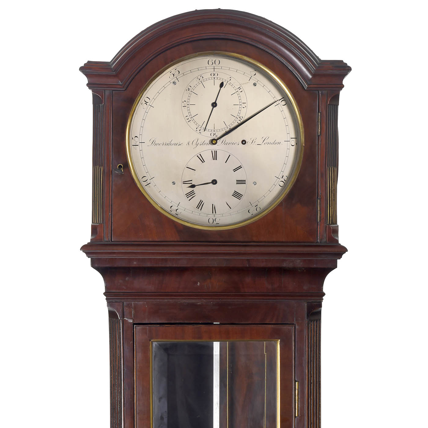 Signed on the dial: "Dwerryhouse & Ogston, Davies Str., London", 10-inch silvered dial with subsidiary seconds and hour rings, weight-driven brass-plate 8-day movement, fully-enclosed mercury pendulum and brass-spoked pulley and weight, mahogany case with beveled glass front door, 71 in. height, with key, good working condition. – Please note: Collection only, shipping not possible due to mercury pendulum.