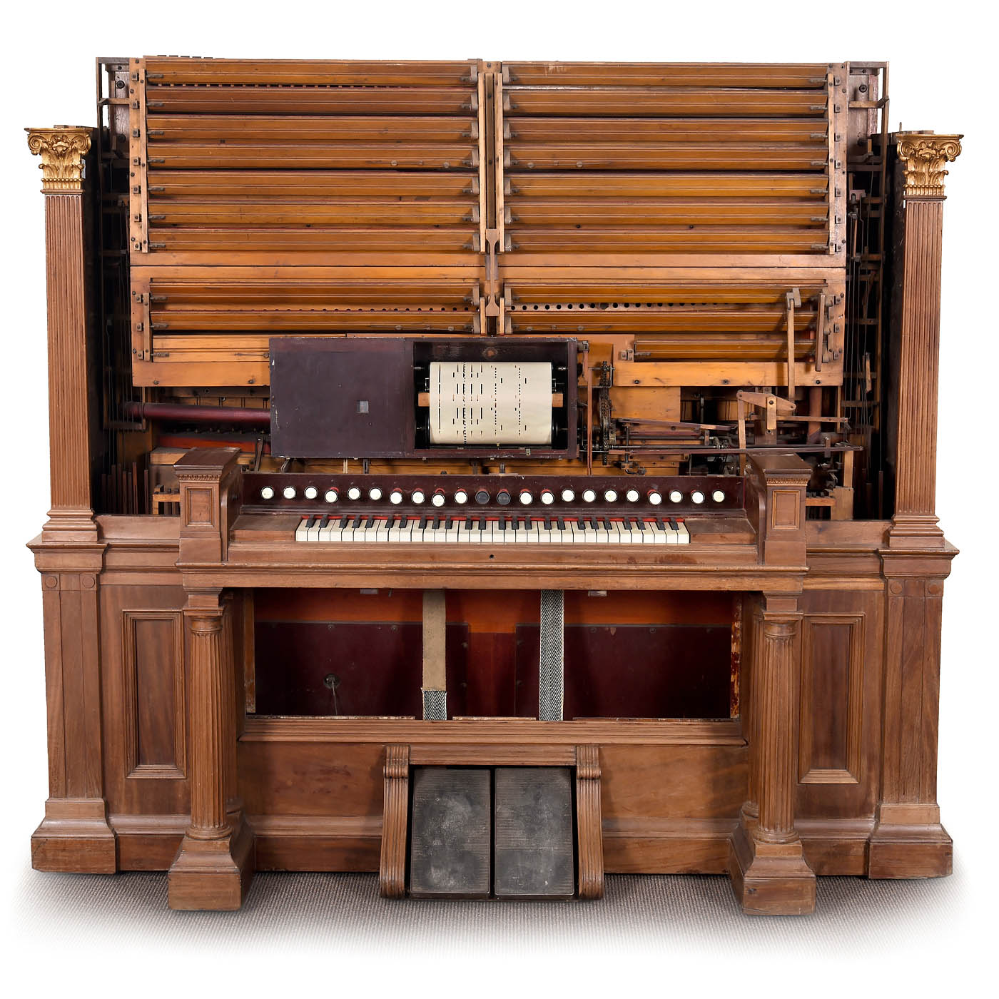 The Aeolian Company, USA. No. 2391, 58 notes, 20 stops, carved mahogany case, 80 x 29 ½ x 71 in., unrestored condition, with 50 music rolls in cabinet. Due to the size and weight transport with a piano shipping company only.