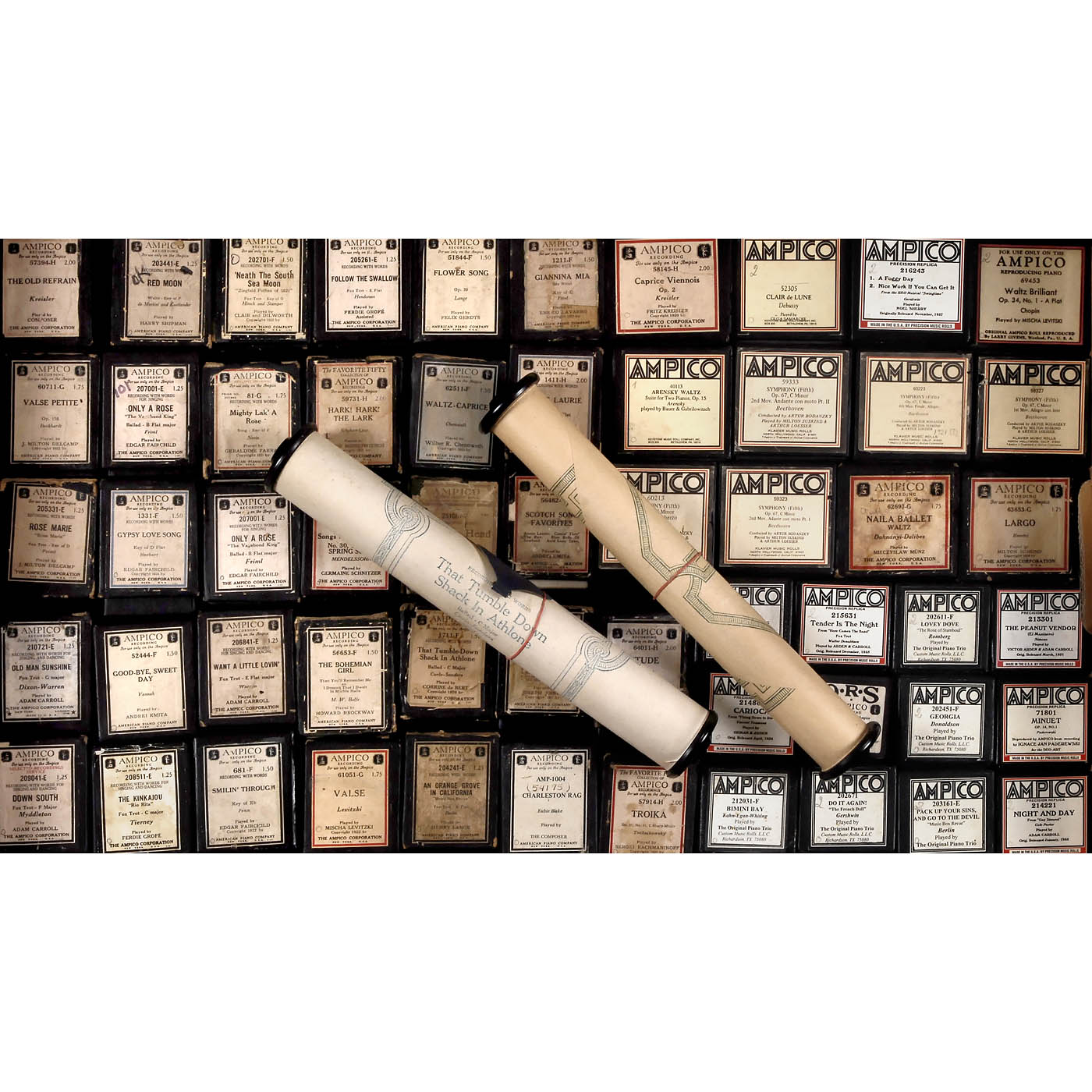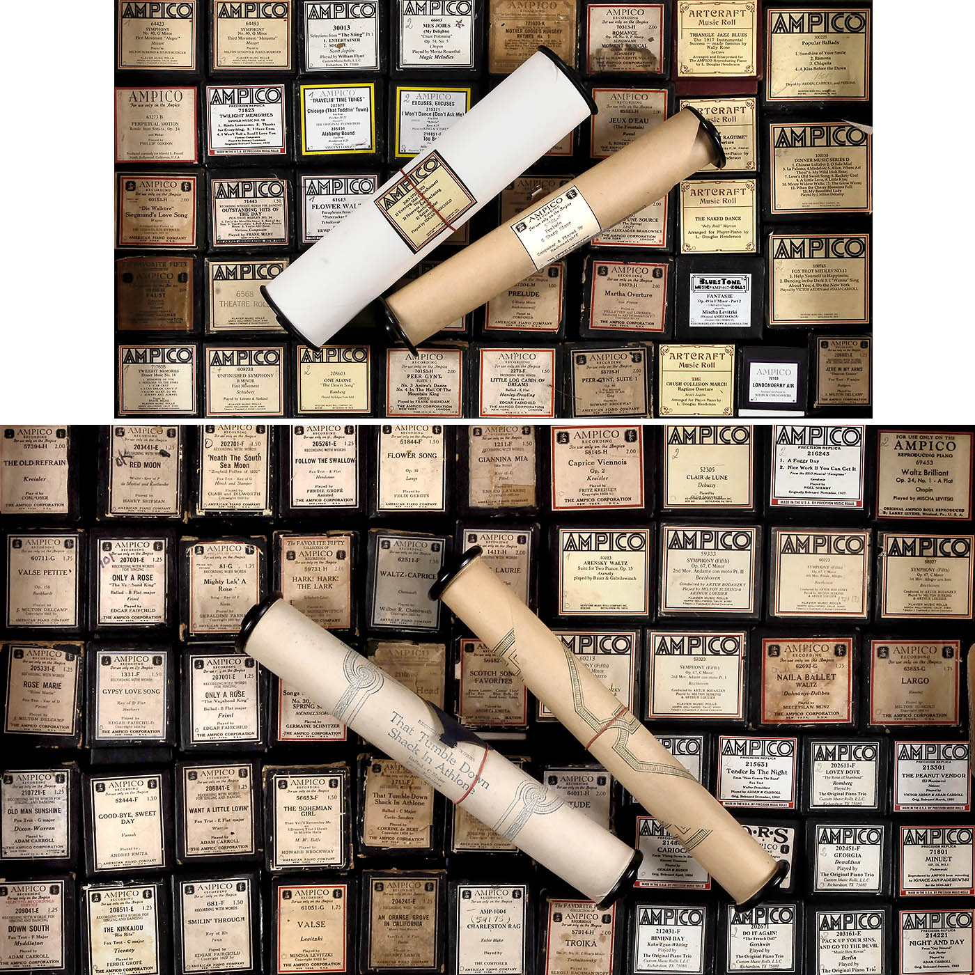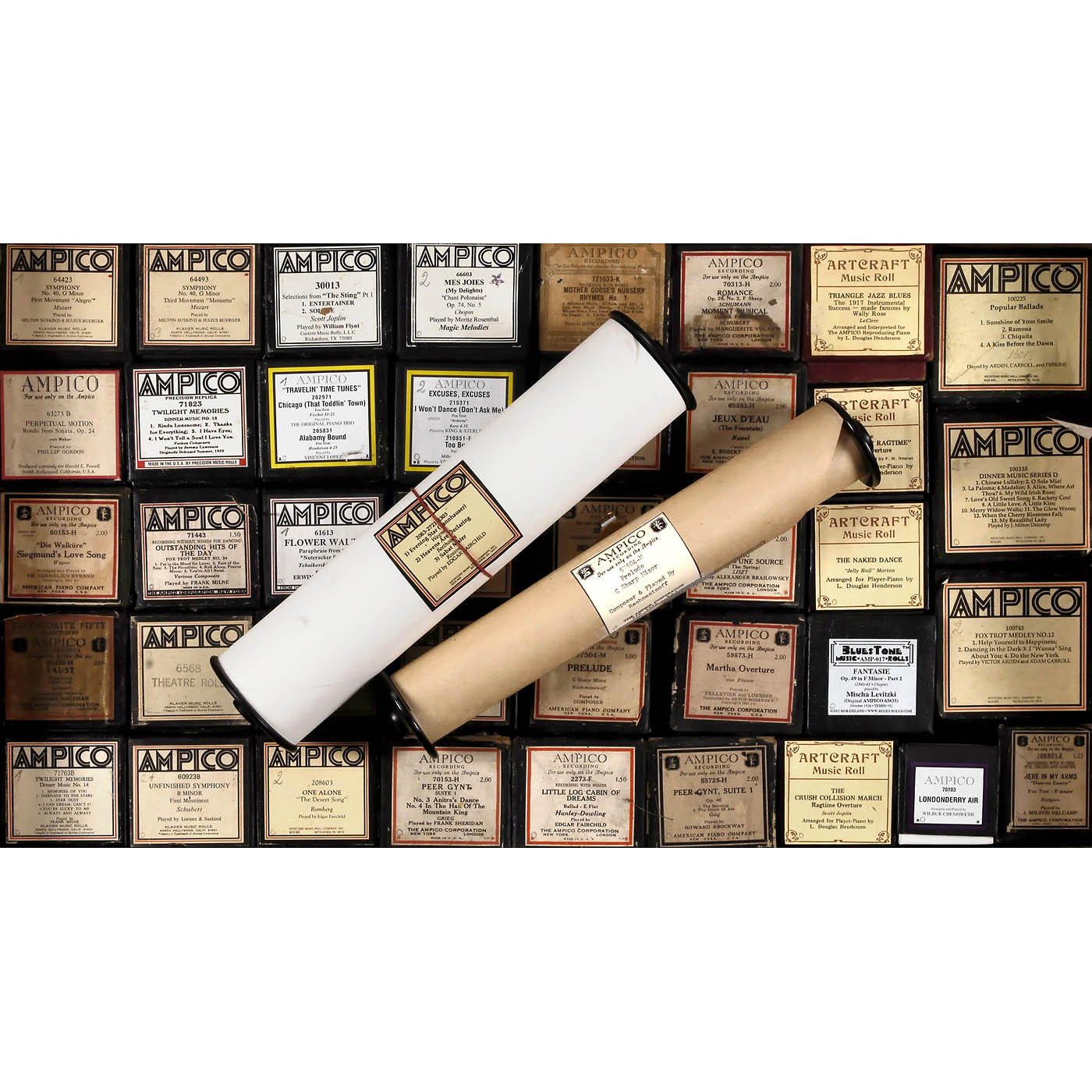 Original rolls by Ampico Corporation and re-cuts by Artcraft and others, in various genres, many classical, mostly in original boxes. Condition: some signs of wear to boxes, rolls in good condition.