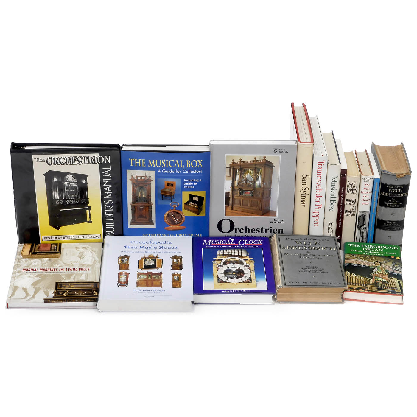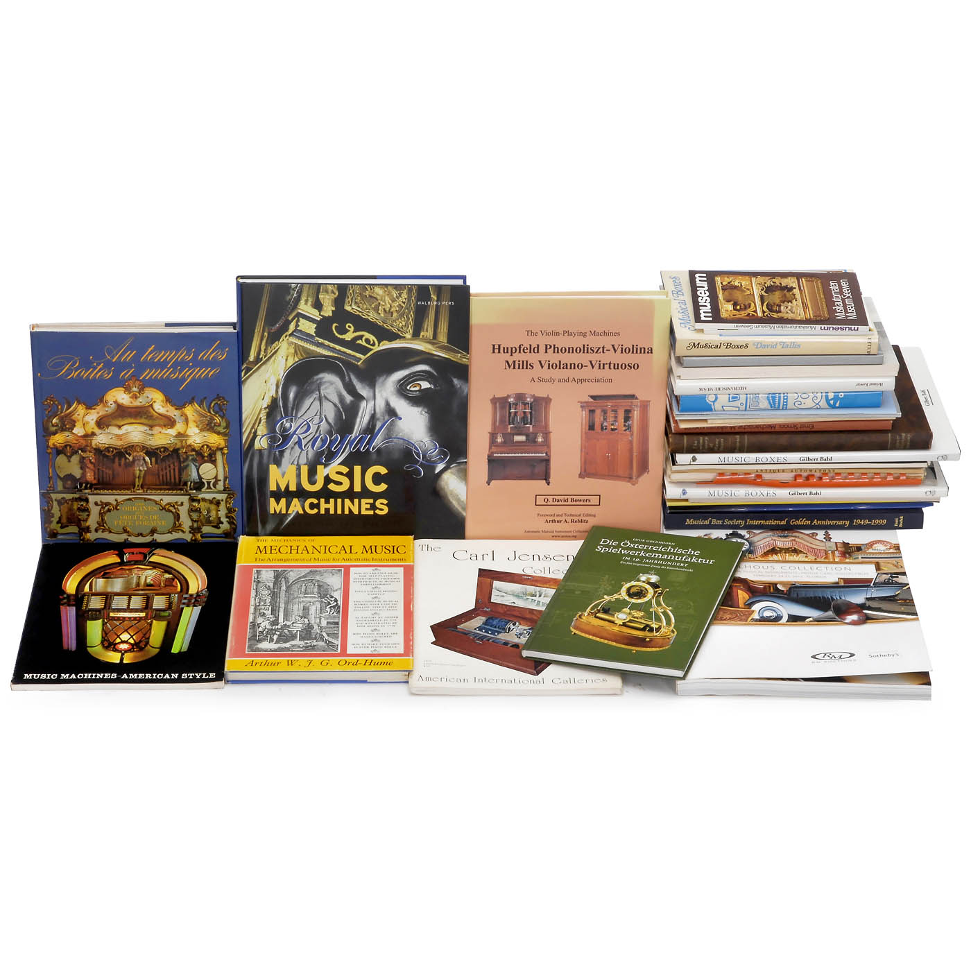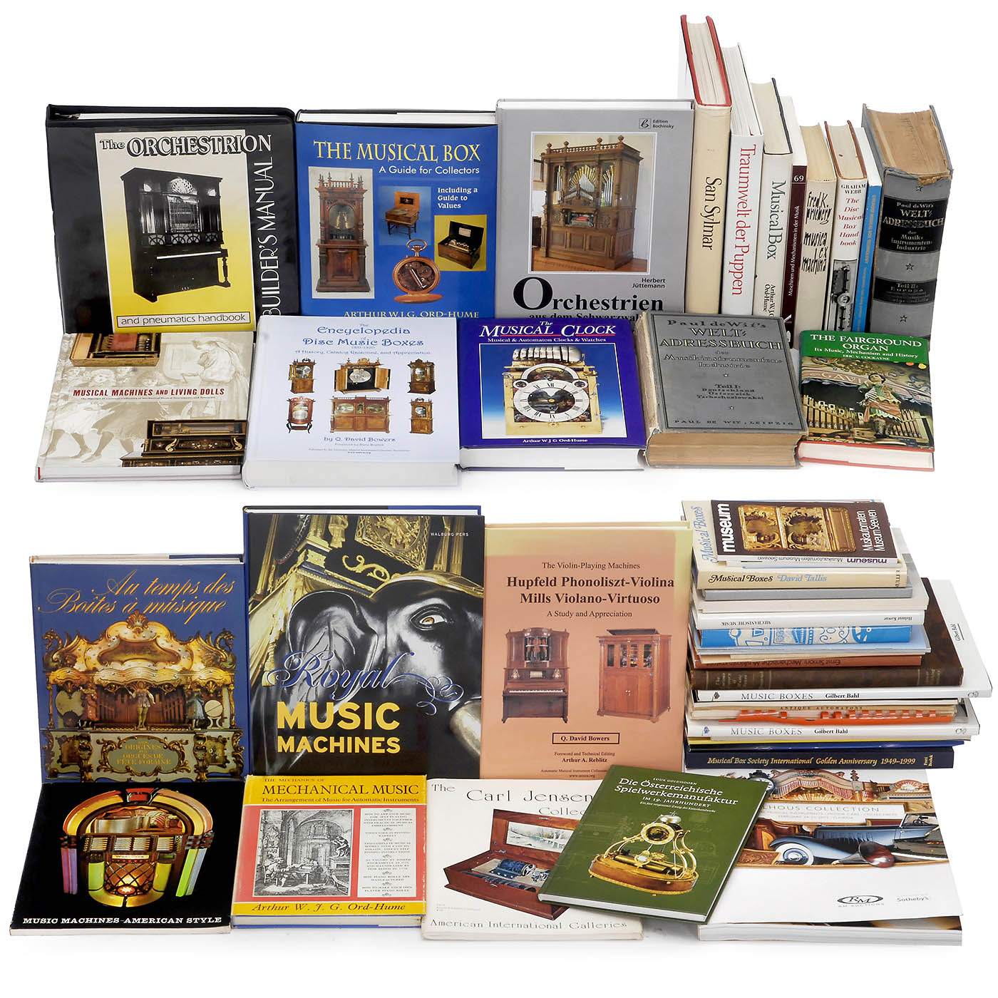 1) "Paul de Wit's Welt-Adressbuch der Musikinstrumenten-Industrie", Volume I and II, Verlag von Paul de Wit, Leipzig 1925/27, 826 and 1310 pages, Volume I without spine. – 2) "The Orchestrion Builder's Manual", Craig Brougher, Automata Press, USA 1992, 238 pages. – 3) "The Musical Box", Arthur W.J.G. Ord-Hume, Schiffer Book, USA 1995, 344 pages. – 4) "Traumwelt der Puppen", Barbara Krafft, Kunsthalle der Hypo-Kulturstiftung, Munich 1991, 360 pages. – 5) "Musical Box – A History and Collector's Guide", Arthur W.J.G. Ord-Hume, George Allen & Unwin, 1980, 410 pages. – 6) "The Encyclopedia of Disc Musical Boxes", Q. David Bowers, AMICA, USA 2016, 686 pages. – 7) "San Sylmar", The Nethercutt Collection, USA 1978, 360 pages. – 8) "Orchestrien aus dem Schwarzwald", Herbert Jüttemann, Edition Bochinsky 1994, 288 pages. – 9) "Musical Machines and Living Dolls", Ellen M. Snyder-Grenier, Morris Museum 2011, 144 pages. – 10) "The Musical Clock", Arthur W.J.G. Ord-Hume, Mayfield Books 1995, 352 pages. – 11) "Cylinder Musical Box Technology", H.A.V. Bulleid, Almar Press 1994, 290 pages. – 12) "The Disc Musical Box Handbook", Graham Webb, Faber & Faber 1971, 322 pages. – 13) "The Mills Violano-Virtuoso", Mike Kitner and Art Reblitz, Vestal Press 1984, 180 pages. – 14) "The Fairground Organ", Eric V. Cockayne, David & Charles 1974, 238 pages. – 15) "Machines and Mechanisms of Music", Michaelsteiner Konferenzberichte, Wißner Verlag 2006, 360 pages. – 16) "Musica ex Machina", Fred H. Prieberg, Verlag Ullstein 1960, 300 pages. – 17) "Mechanische Singvögel", Peter Schuhknecht, limited edition 1977, 152 pages. – 18) "From Music Boxes to Street Organs", R. De Waard, Vestal Press 1967, 262 pages. – 19) "Mechanische Musik", Helmut Kowar, Vom Pasqualatinhaus 1996, 254 pages. – 20) "Die Österreichische Spielwerkemanufaktur", Luuk Goldhorn, limited edition, 176 pages. – 21) "The Curious History of Music Boxes", Roy Mosoriak, Lighter Publishing 1943, 242 pages. – 22) "The Violin-Playing Machines", Q. David Bowers, Amica 2012, 156 pages. – 23) "Royal Music Machines", Walburg Pers, 2006, 286 pages. – 24) "Milhous Collection", RM Auctions 2012, auction catalog with list of results, 274 pages. – And: 25) 30 other books and catalogs.