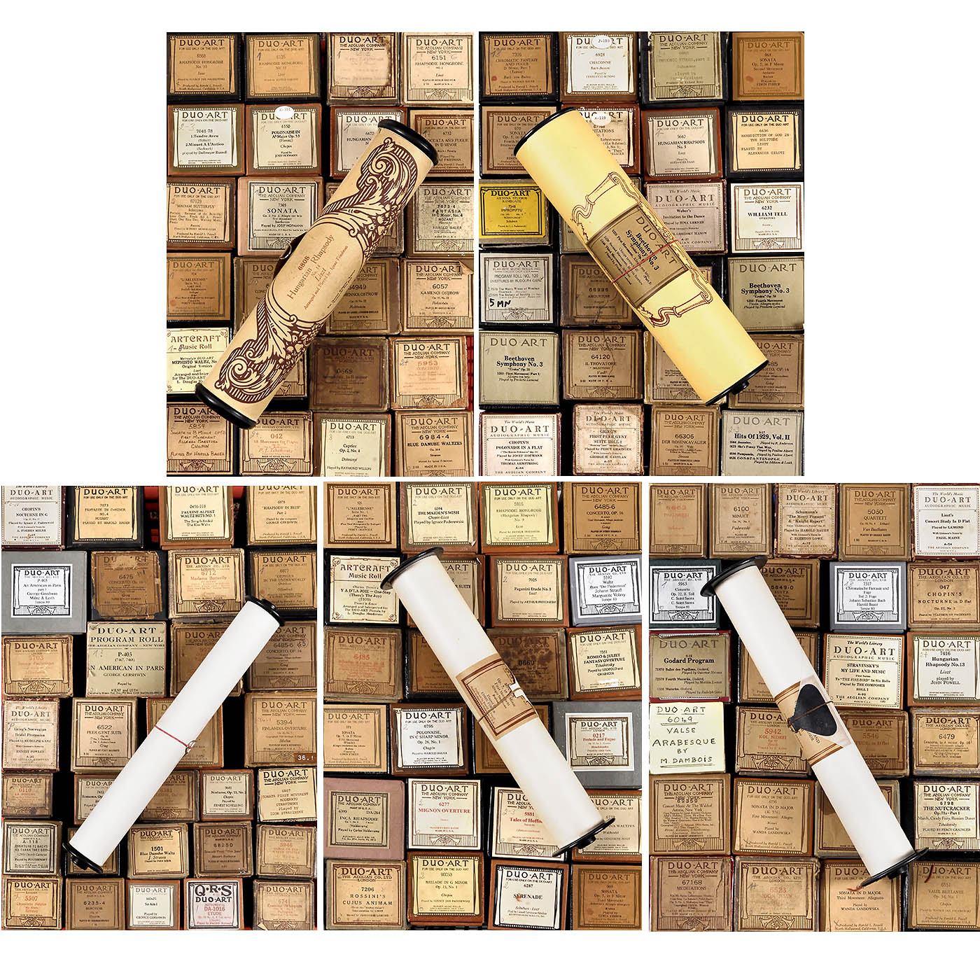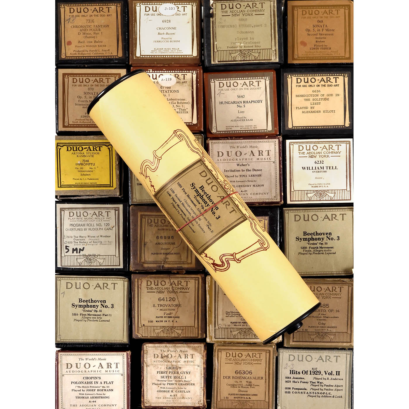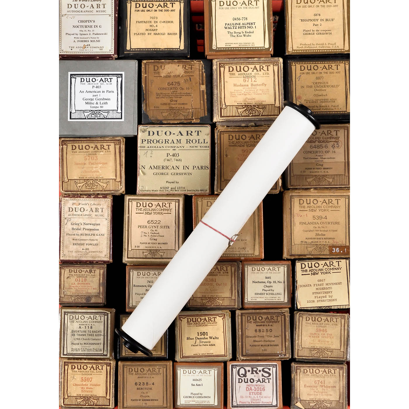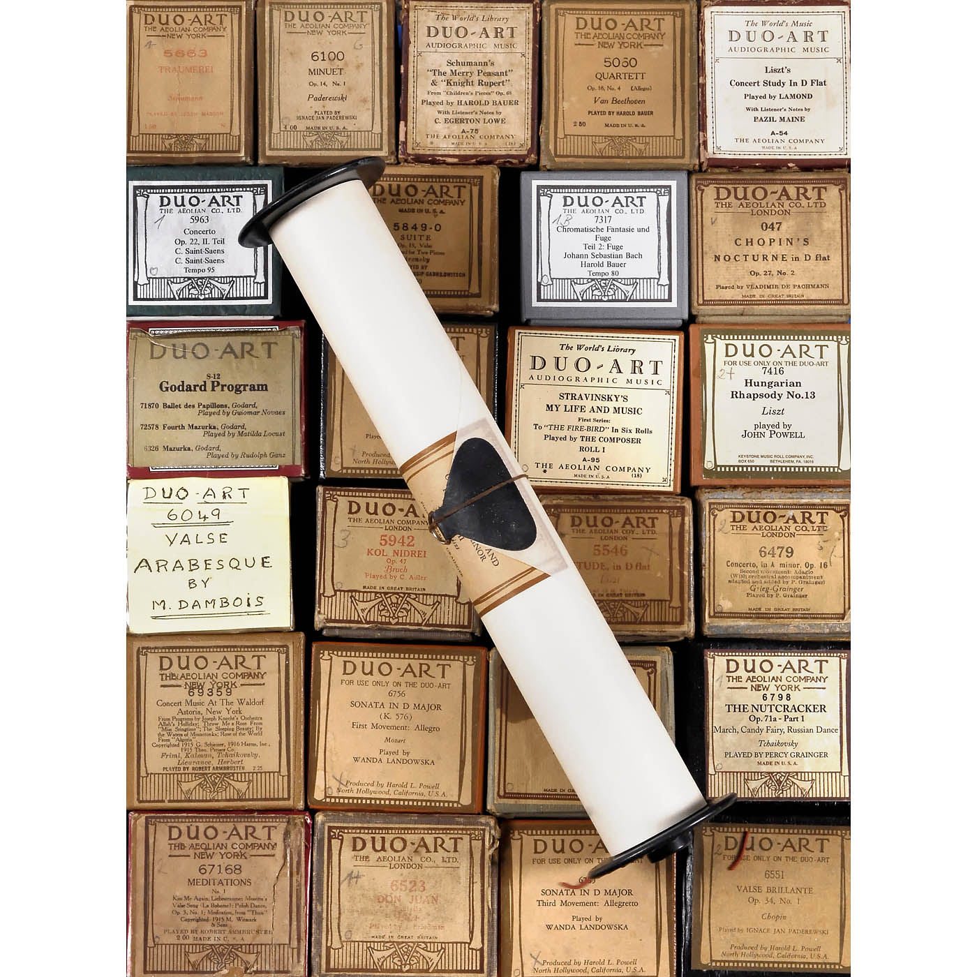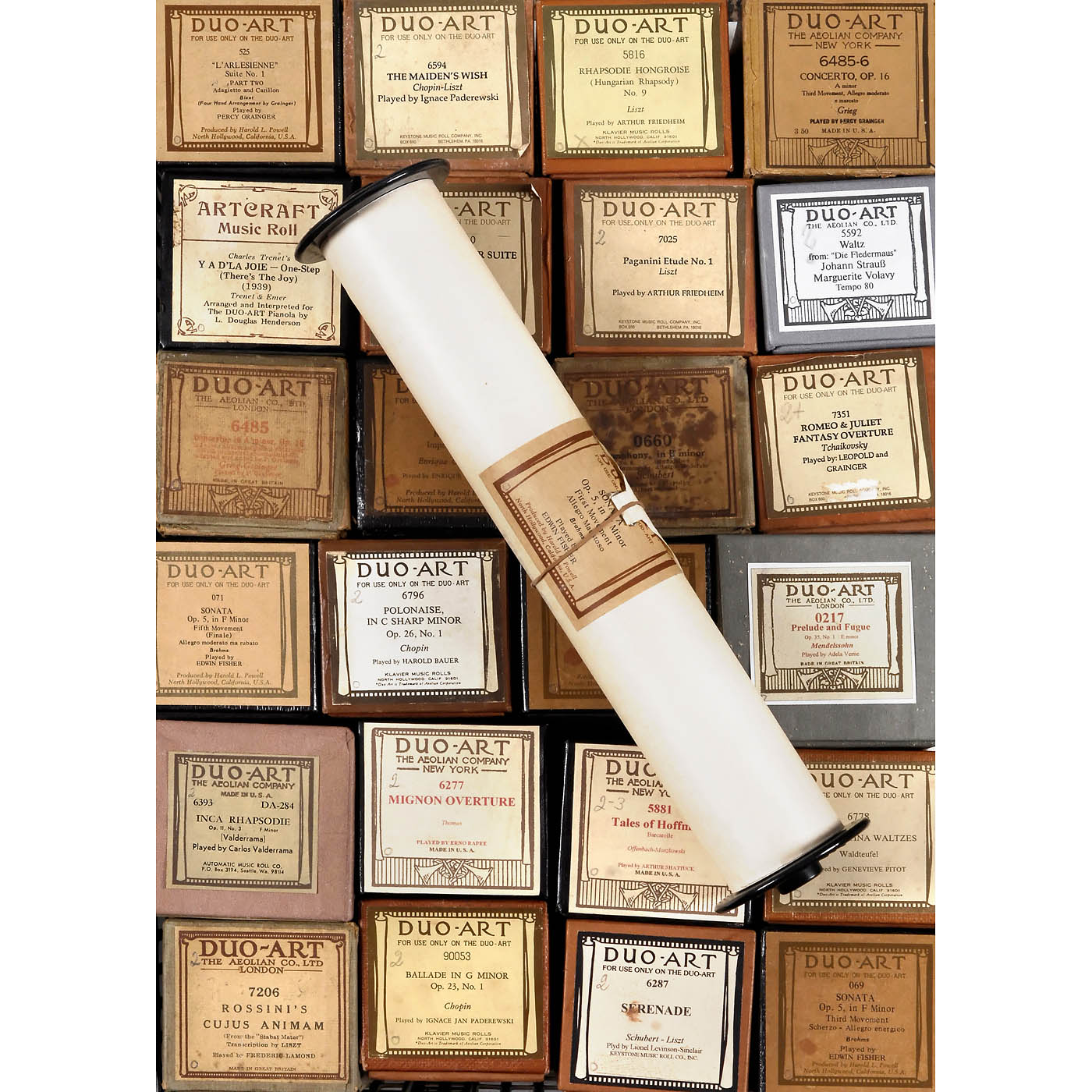 Mostly originals by Aeolian Company, with a few re-cuts by Automatic Music Company, QRS and others, in various genres but predominantly classical, all in original boxes, minor signs of wear to boxes, rolls in good condition. – In addition: 1927 catalog "Duo-Art Piano Music".
