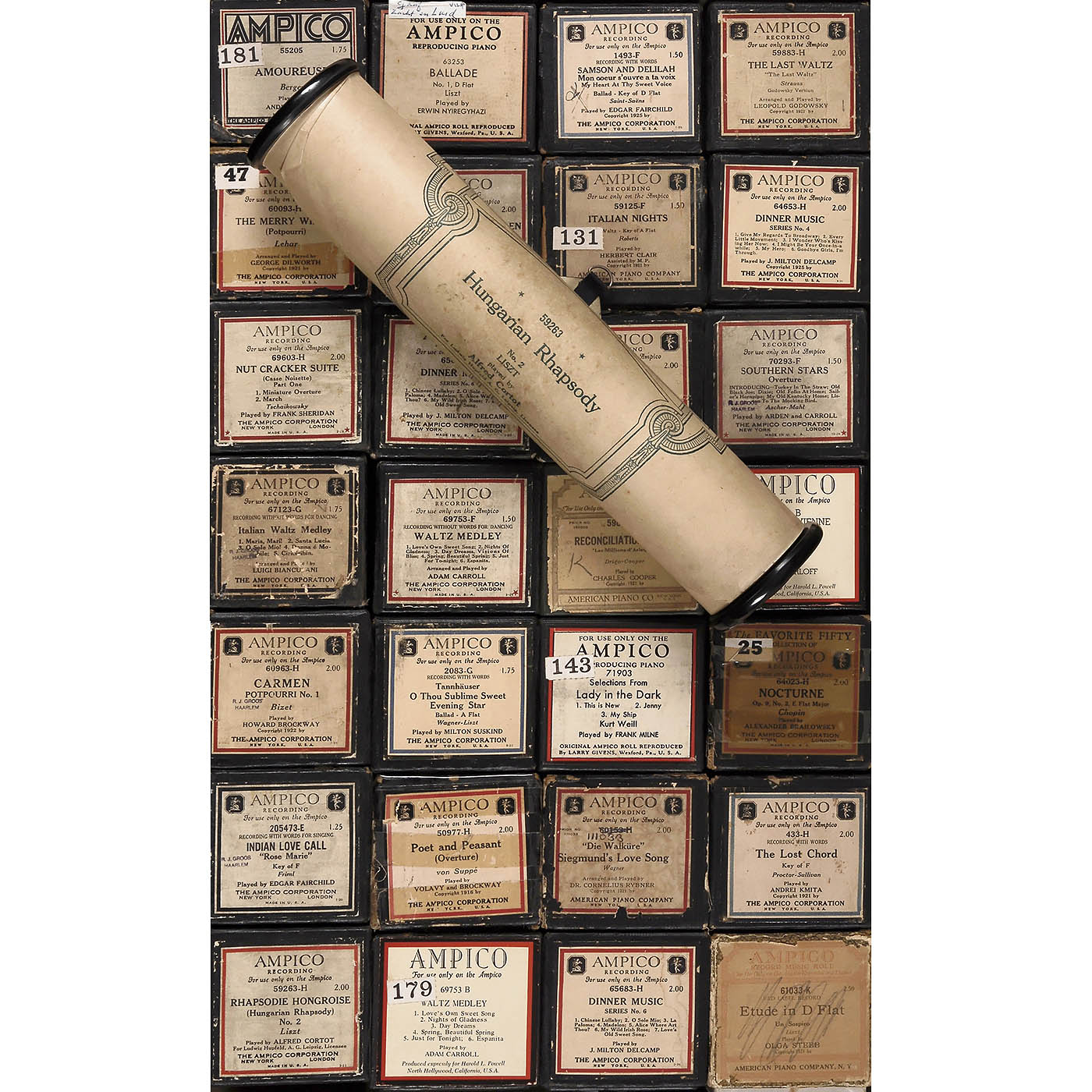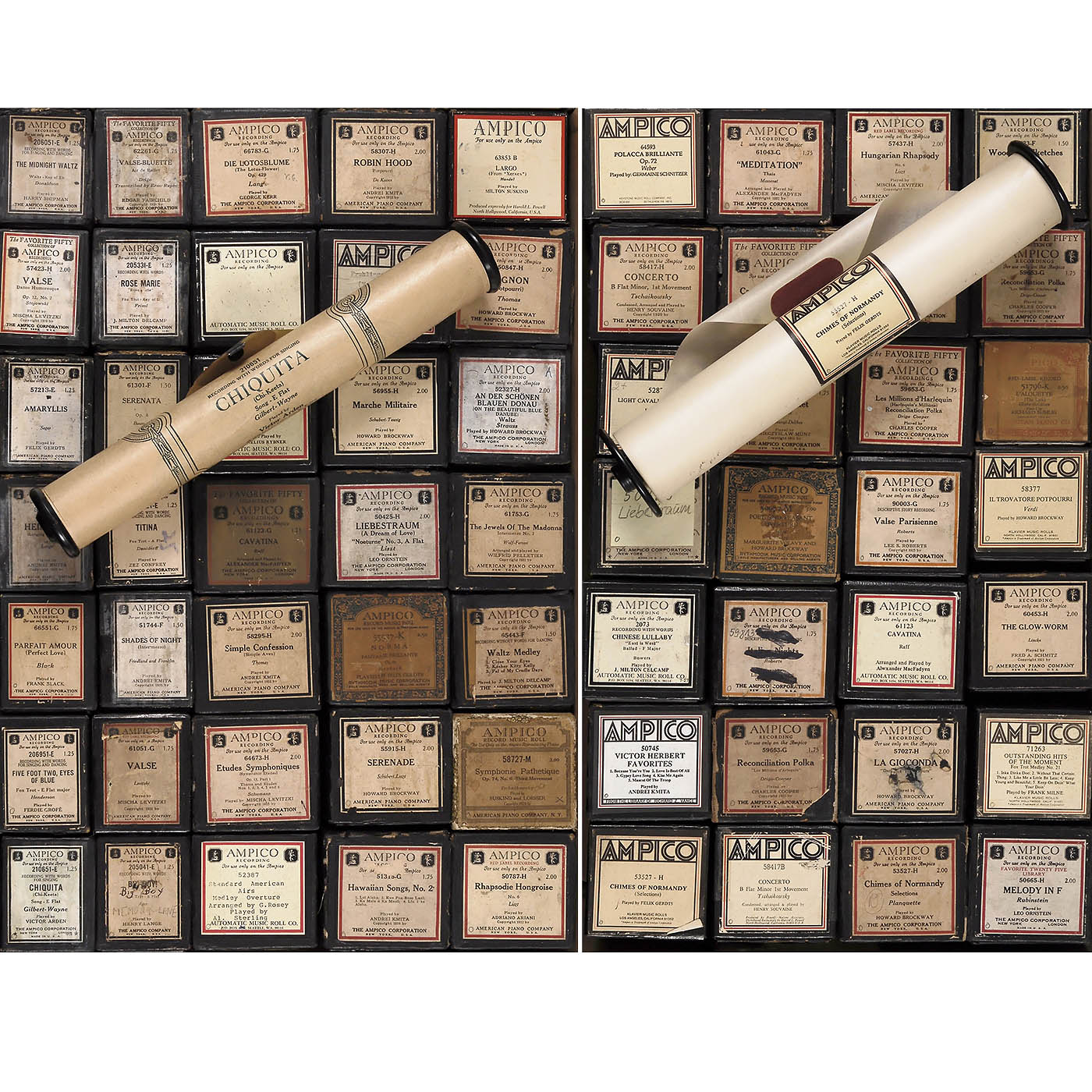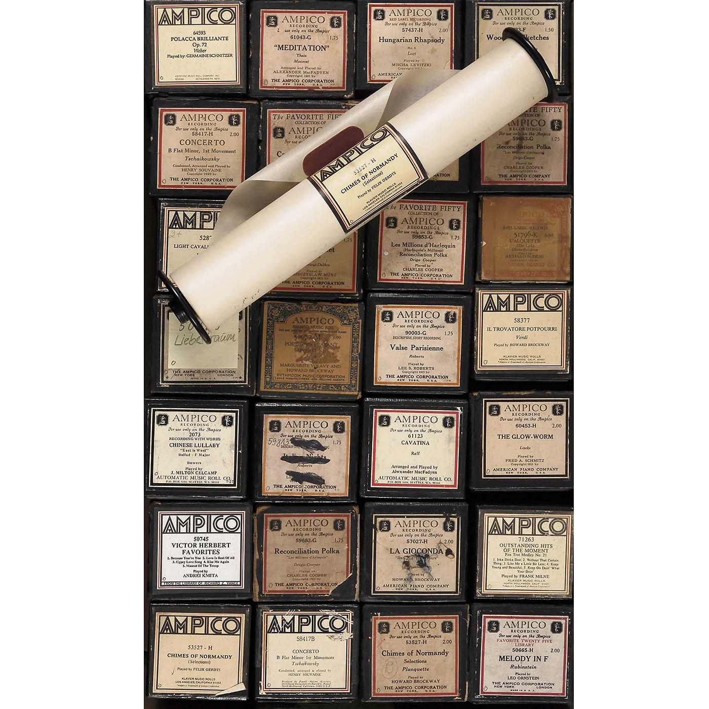 Original rolls by Ampico Corporation and re-cuts by Automatic Music Roll Co. and others, in various genres, predominantly classical, most in their original boxes. Condition: minor signs of wear to boxes, rolls in good condition.