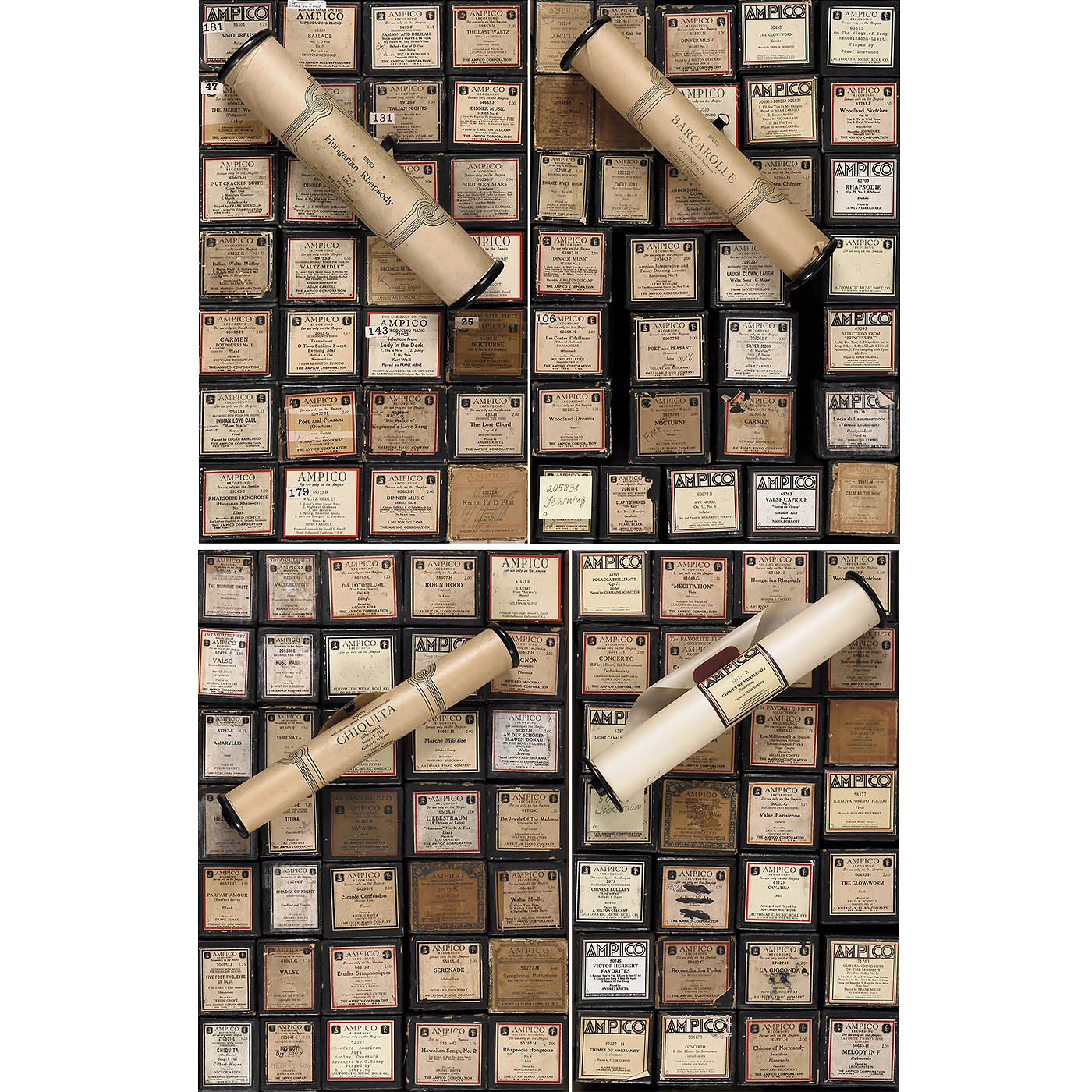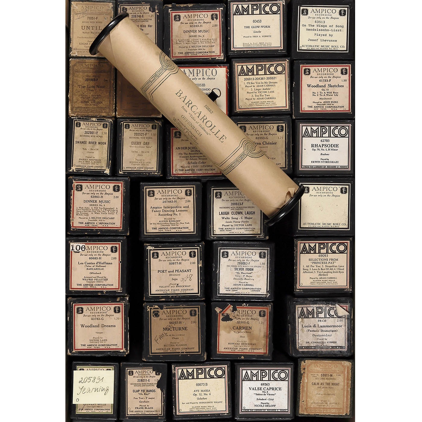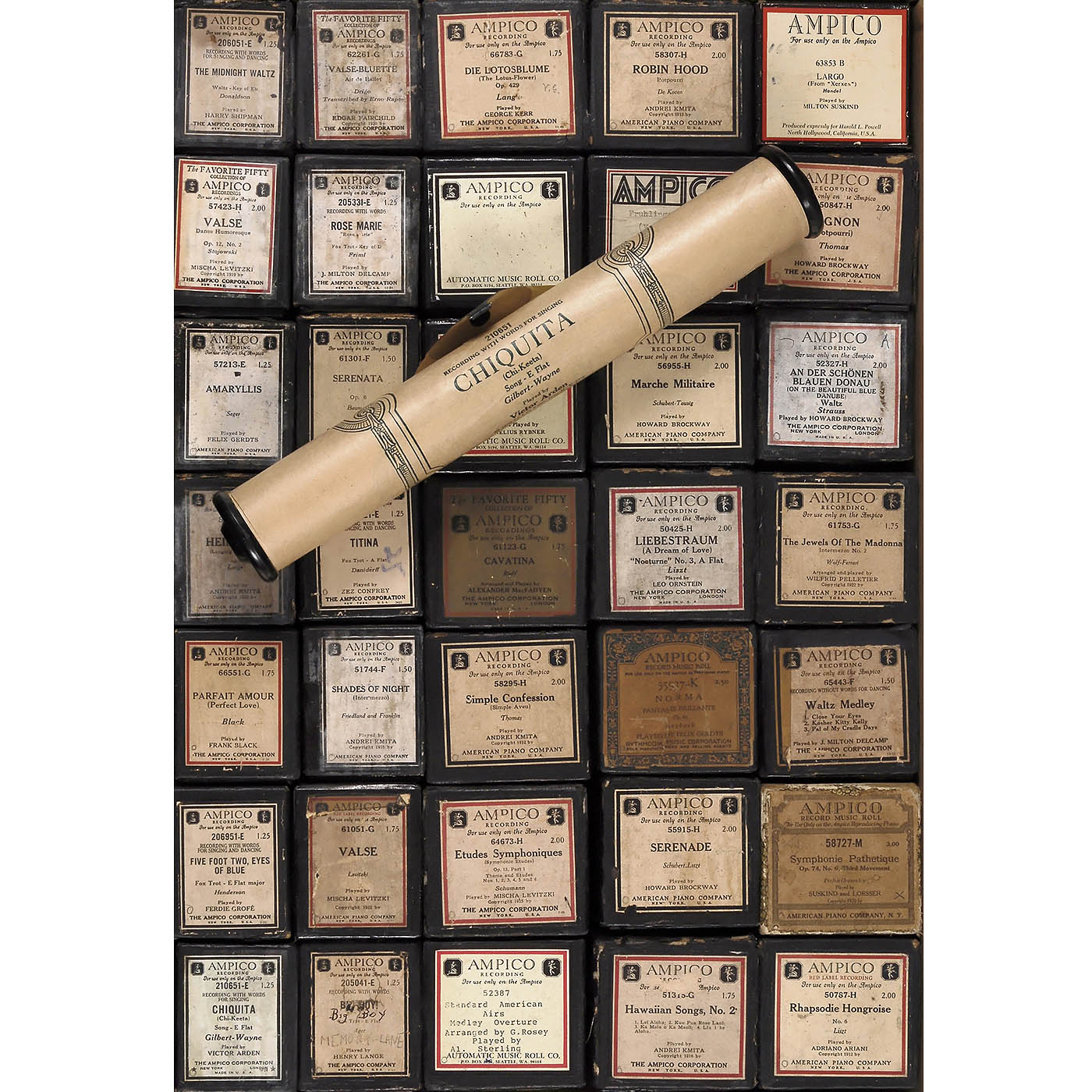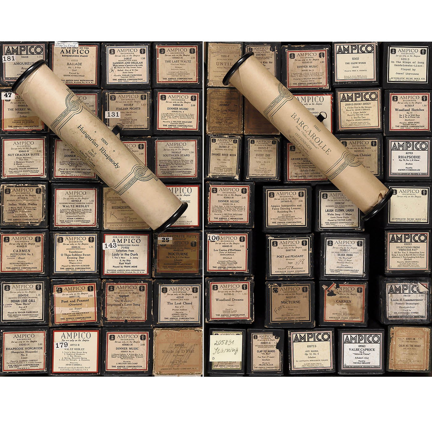 Original rolls by Ampico Corporation and re-cuts by Automatic Music Roll Co. and others, in various genres, predominantly classical, most in their original boxes. Condition: minor signs of wear to boxes, rolls in good condition.