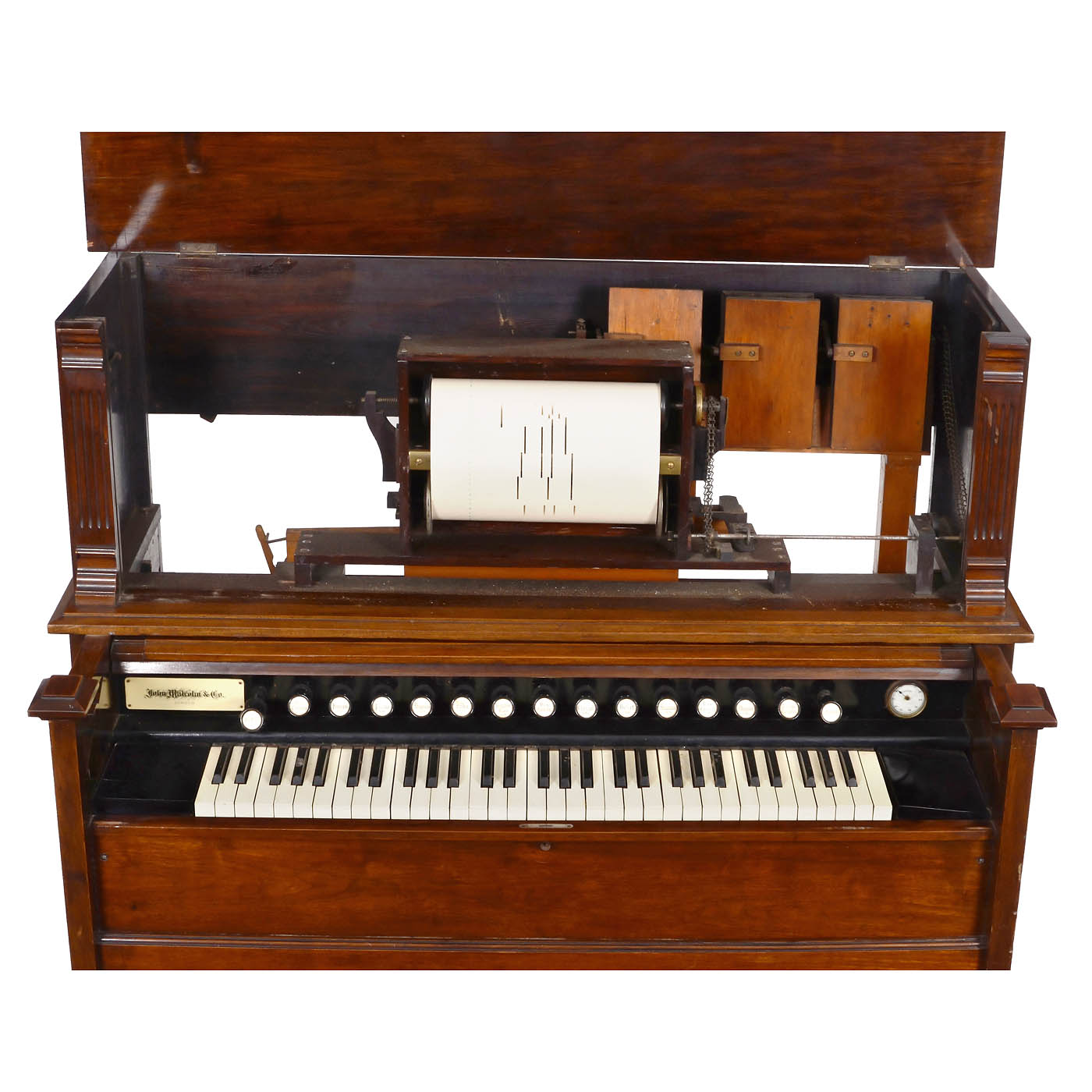 John Malcolm & Co., London. Suction-operated instrument, with following registers: Re-Roll, Bass Coupler, Principal 4', Piano 4', Echo 8', Diapason 8', Forte, Vox Humana, Bourdon Bass 16', Melodia 8', Clarionet 16', Dulciana 8', Vox Celesta 8', Dulcet 8', treble coupler and motor with a small clock dial to indicate gradually increasing tempo, walnut case, missing rear panel, size 48 ½ x 25 1/3 x 57 ½ in., the casework is in generally good condition, mechanism in need of repair. – A scarce mechanical musical instrument. With 50 rolls.