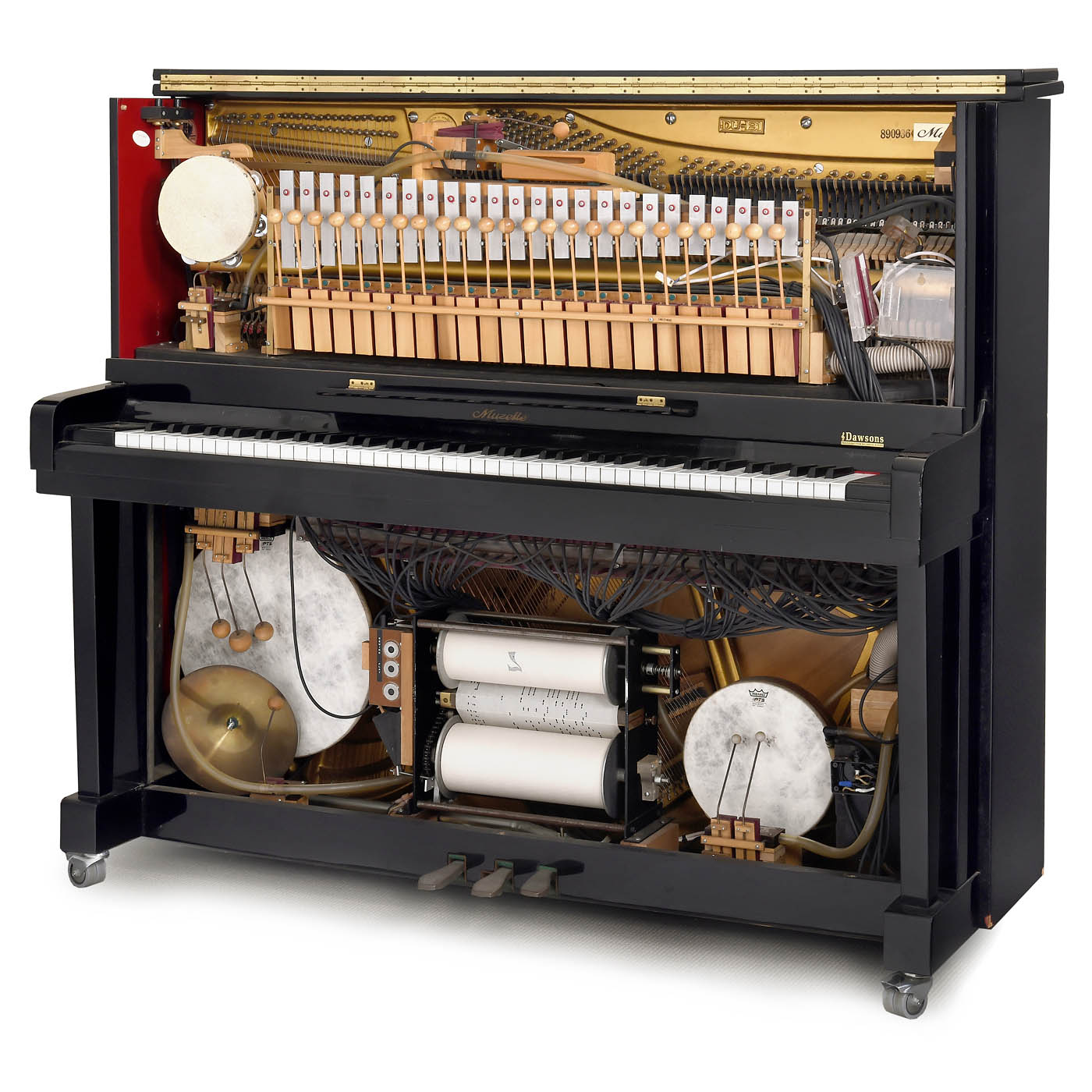 Muzelle DU-131 Player Piano, Sojin Piano Co., 110 V keyboard orchestrion with full instrumentation: automatic piano, 24-note xylophone, tambourine, wood block, 2 drums and mandolin in colorfully glazed black polished case, partially working condition, electric motor for roll-drive defective. – With 2 long-playing "O" rolls of 10 popular songs each. – Due to the size and weight of the instrument, transport with a piano shipping company only.