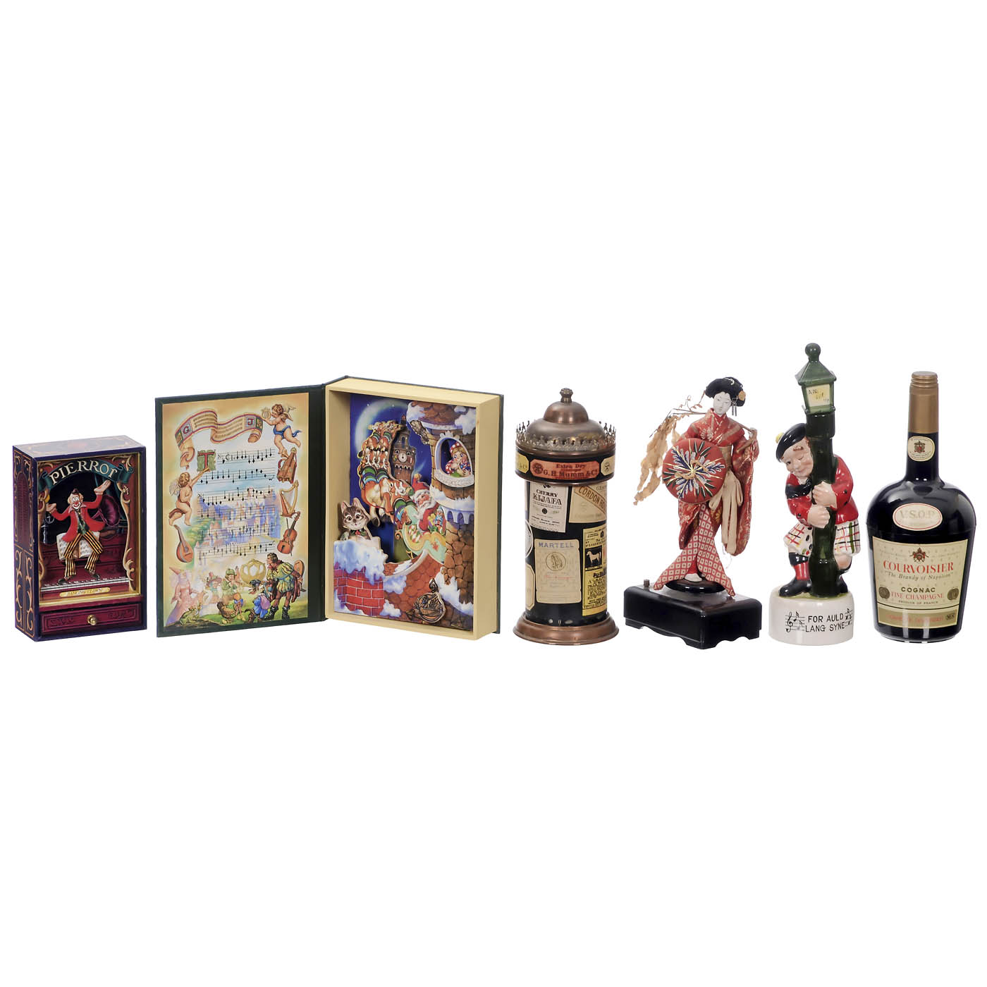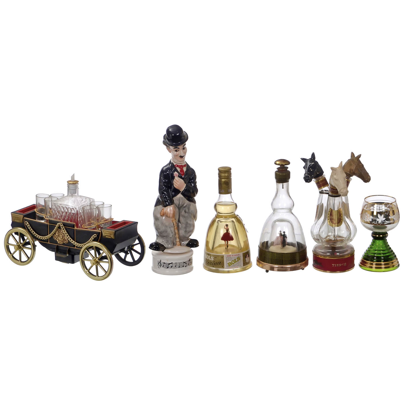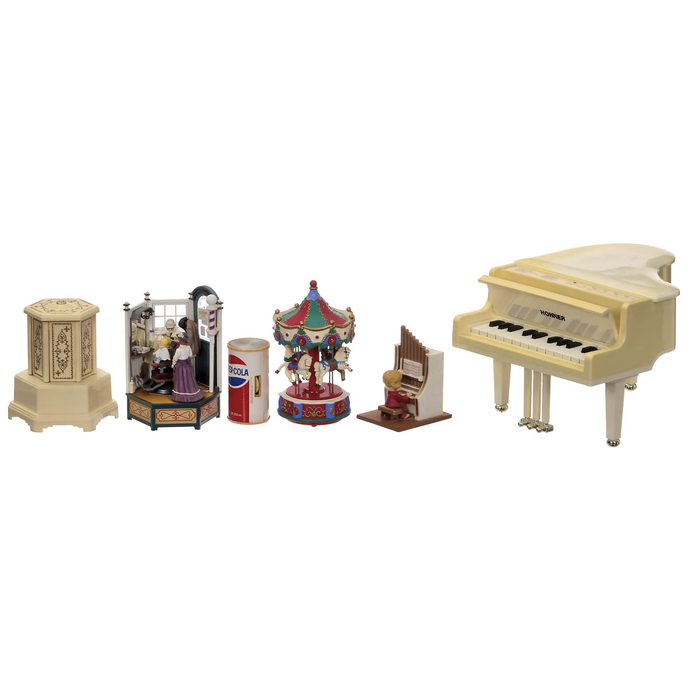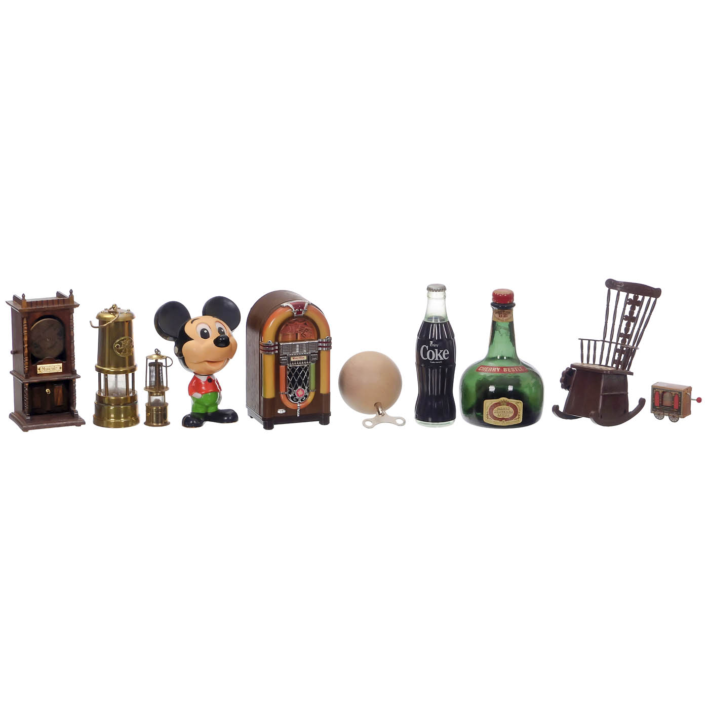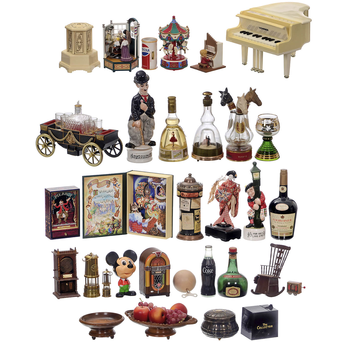 Hohner piano (battery-compartment needs cleaning); carriage with liquor set; hair salon with moving dolls; carved fruit bowl with artificial fruits; Japanese dancer; cigarette temple; horse carousel; "Pierrot" dancing clown; miniature grandfather clock; Bols ballerina, liquor bottle with dancing doll; Charlie Chaplin, ceramic; advertising pillar with drinks advertisement: and many more parts. – In addition: 3 toy radios and a talking Mickey Mouse.