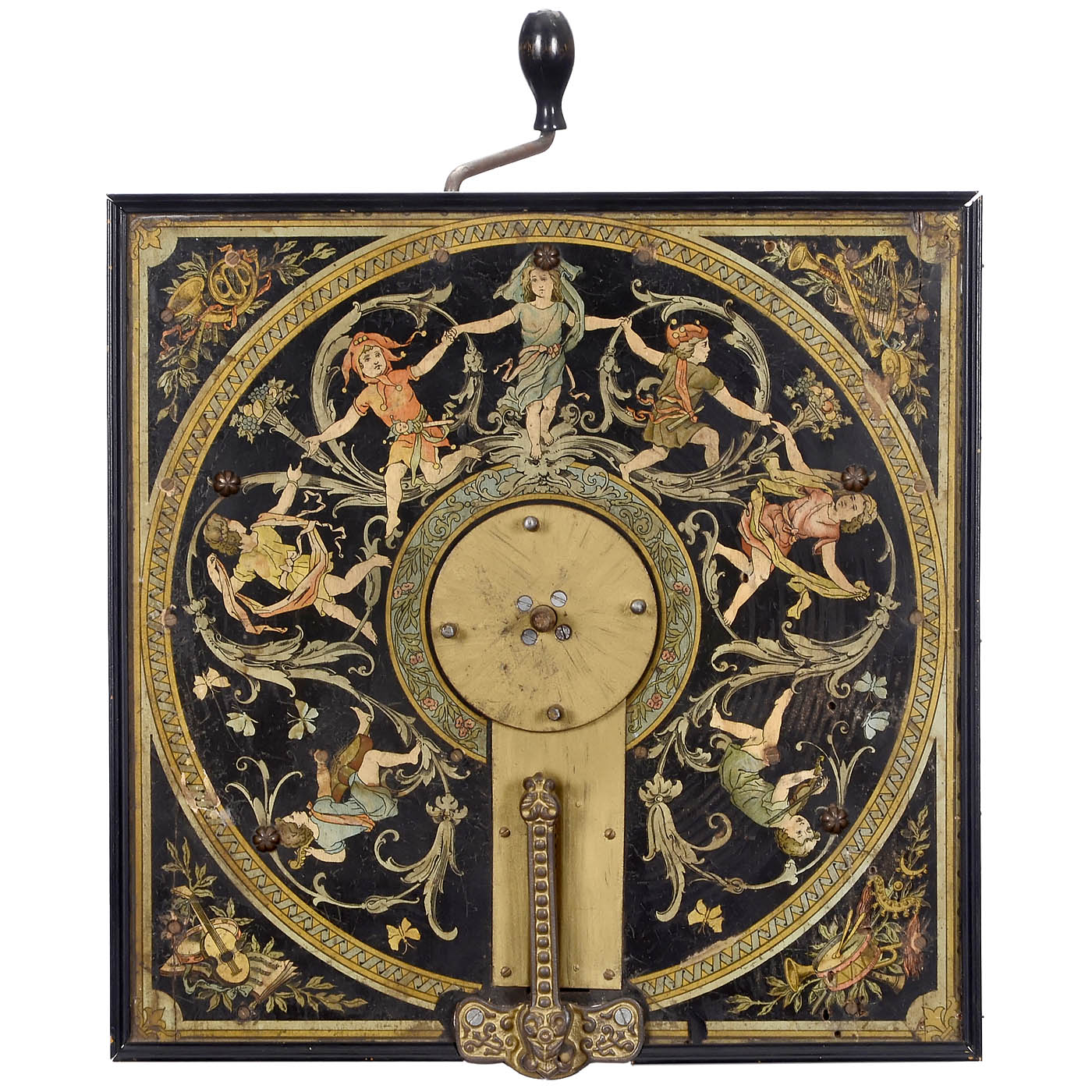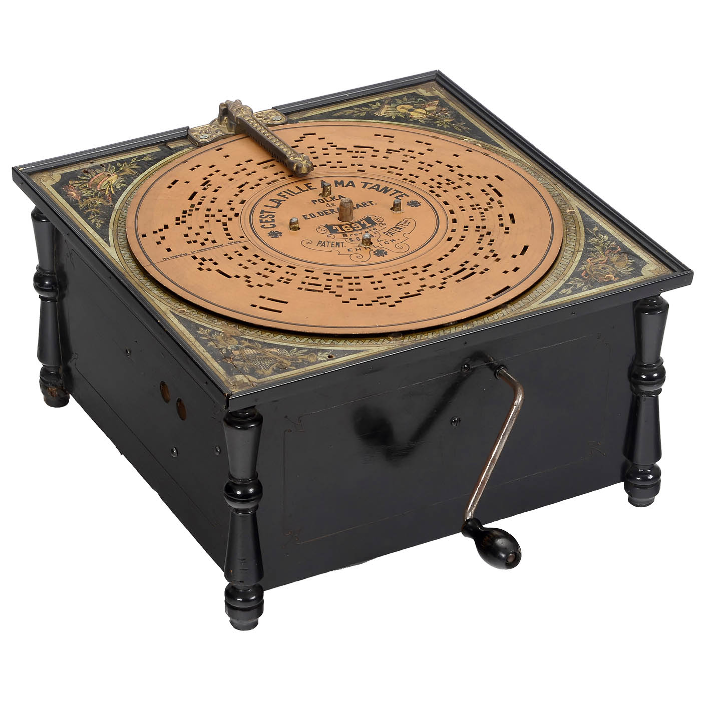 Paul Ehrlich, Leipzig. 19 reeds, for Ø 11 2/5 in. cardboard discs, wood case, lithograph on lid, crank-operated, restored, good playing condition.