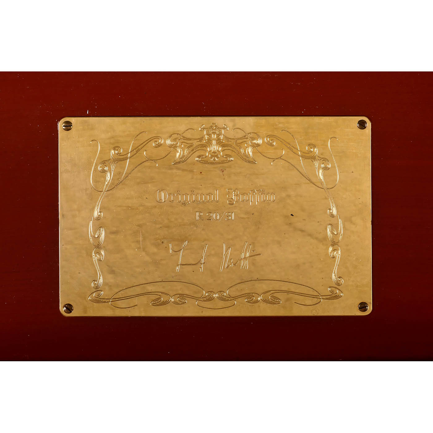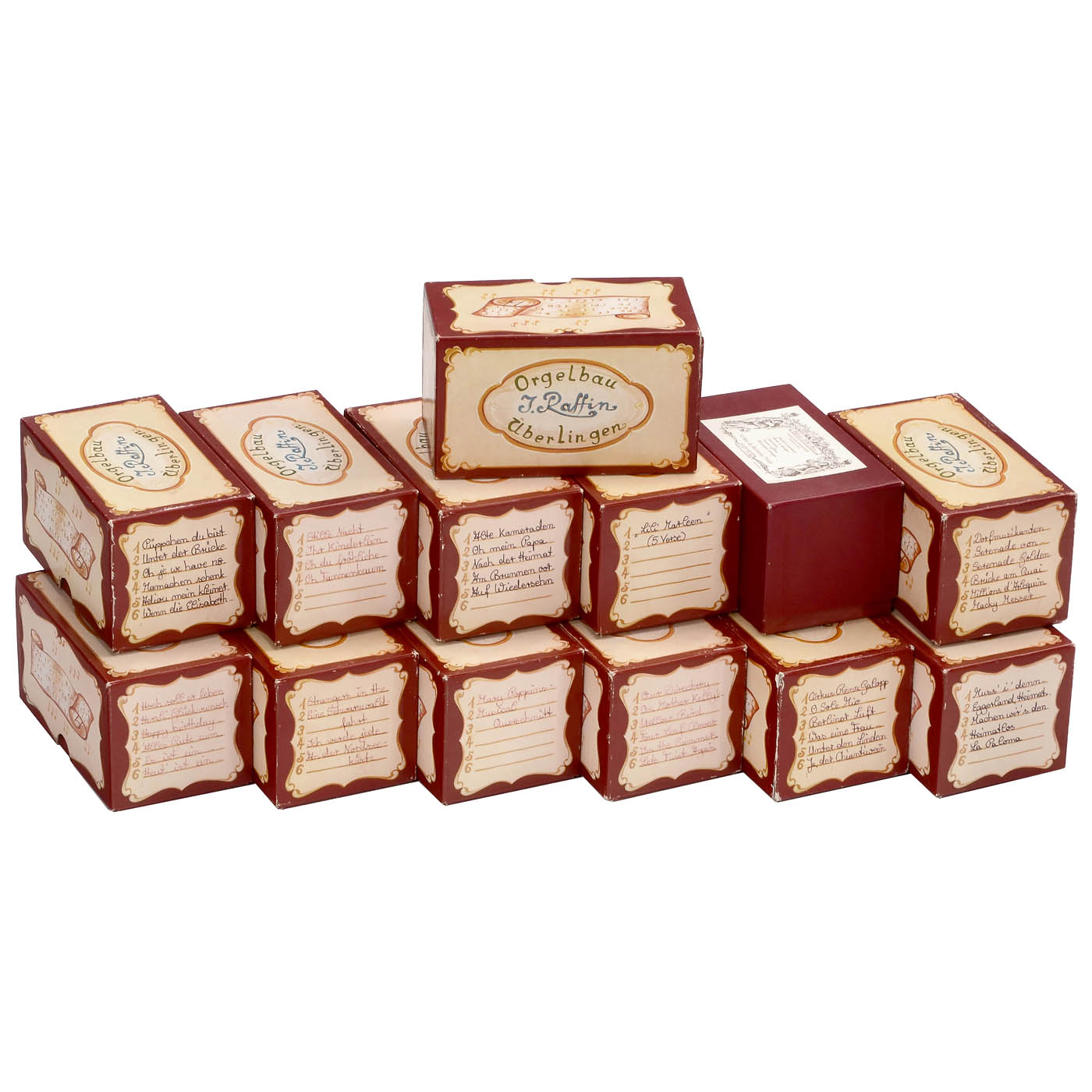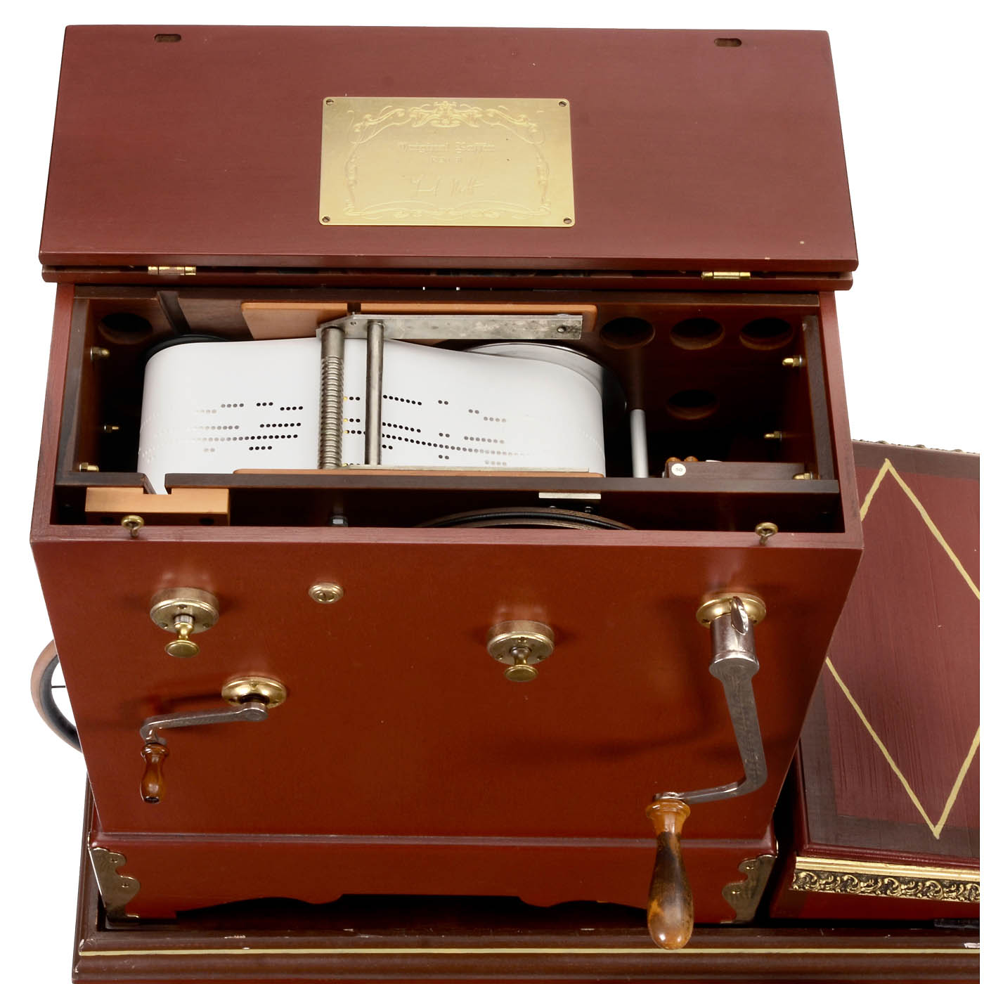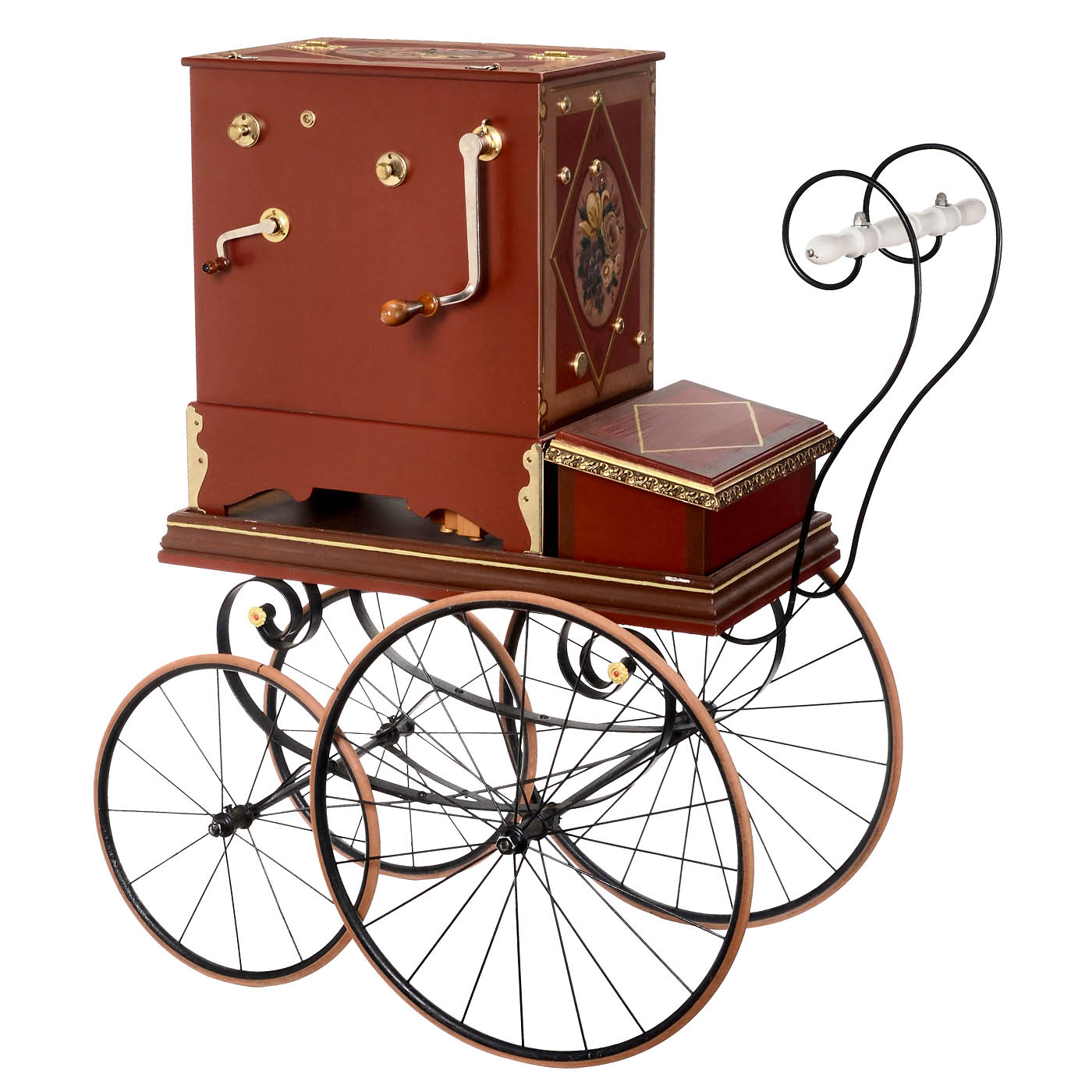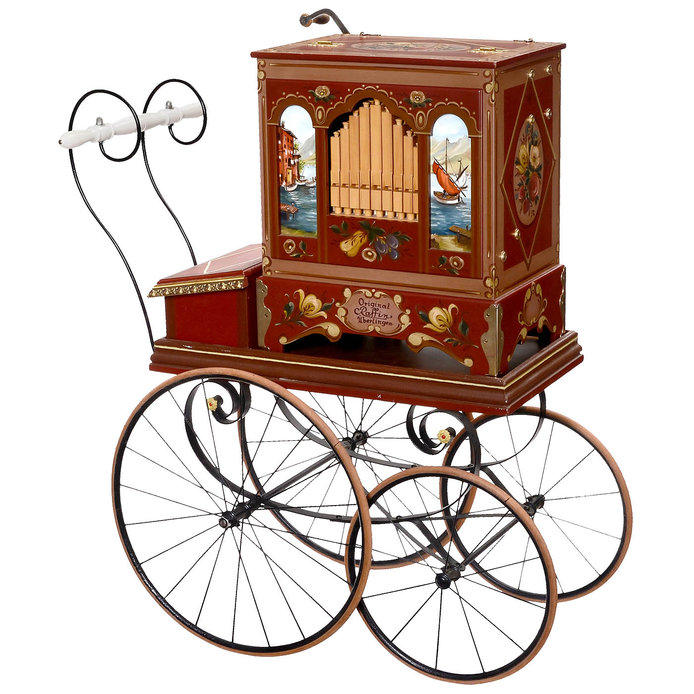Orgelbau Josef Raffin in Überlingen, Germany, 20 notes, 31 pipes in 2 stops, roll-operated, hand crank, second rewind crank, four sides hand-painted, playing condition, in need of more air pressure, with 11 music rolls, on spring-loaded organ cart with spoked wheels.