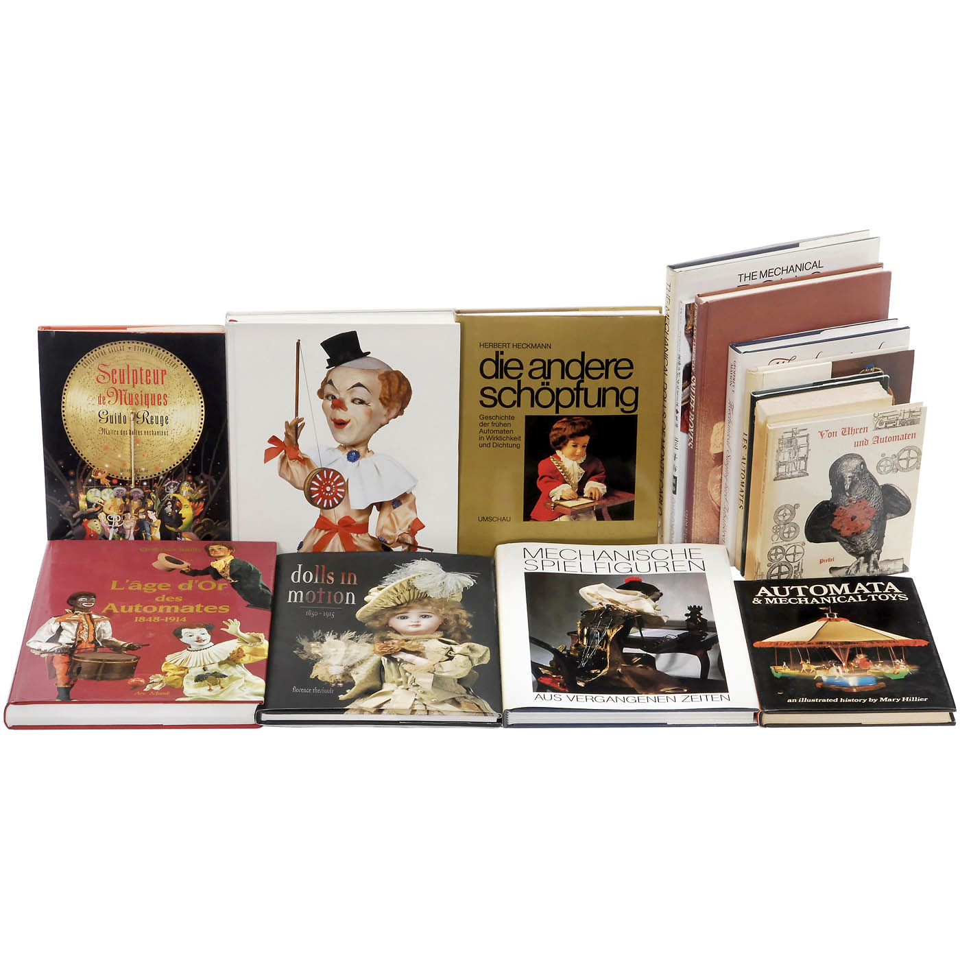 1) "Les automates dans les oeuvres d'imagination", Alfred Chapuis, Éditions du Griffon 1947, 270 pages, with illustrations by Alex Billeter, uncut! – 2) "Mechanical Singing-bird Tabatières", Geoffrey T. Mayson, Great Britain 2000, 256 pages. – 3) "Traumwelt der Puppen", Barbara Krafft, Kunsthalle Munich 1992, 360 pages. – 4) "L'age d'Or des Automates 1848–1914", Christian Bailly, Ars Mundi 1991, 360 pages. – 5) "The Other Creation", Herbert Heckmann, Umschau Verlag 1982, 288 pages. – 6) "The Mechanical Dolls of Monte Carlo", André Soriano, Editions André Sauret 1985, 176 pages. – 7) "Automata & Mechanical Toys", Mary Hillier, Jupiter Books 1976, 200 pages. – 8) "European and American Snuff Boxes 1730–1830", Clare Le Corbeiller, Chancellor Press 1966, 120 pages. – 9) "Sculpteur de Musiques Guido Reuge", Editions la Sarine, 144 pages. – 10) "Mechanische Singvögel", Peter G. Schuhknecht, Germany 1977, 152 pages. – 11) "Les Automates par Éliane Maingot", Librairie Hachette 1949, 96 pages. – 12) "Von Uhren und Automaten", Klaus Maurice, Prestel Verlag, Munich 1968, 96 pages. – 13) "Automata", Rokusho, Japanese book, 96 pages. – 14) "Mechanical Toys from Times Past", André Soriano, Editions André Sauret 1985, 176 pages. – And: 15) "Dolls in Motion 1850–1915", Florence Theriault, Gold Horse Publishing 2000, 104 pages, with CD.