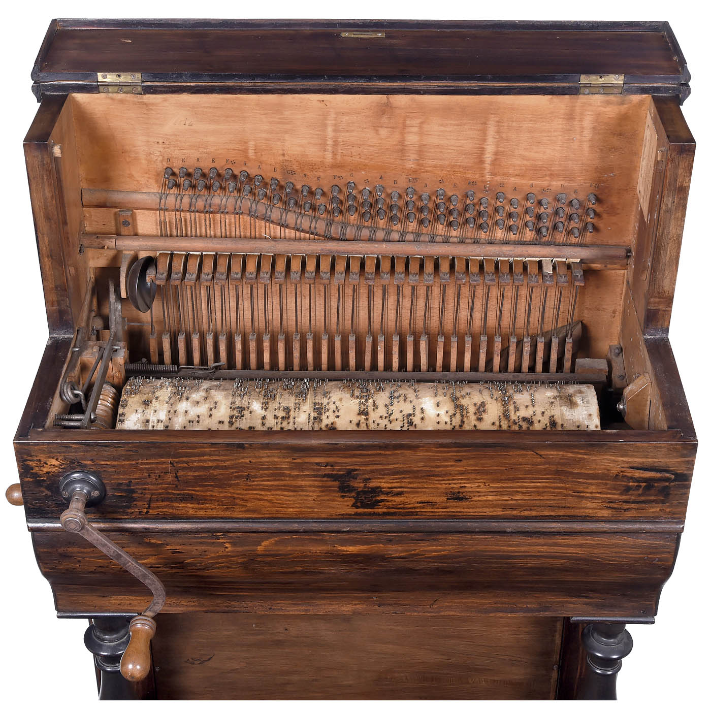 Giuliano, Gran Fabrica di Pianini a Cilindro. With 29 piano notes, bell, two 8-air pinned wood barrels, one in wood crate, hand-cranked, wood case, 29 x 19 x 42 ½ in., good playing condition.