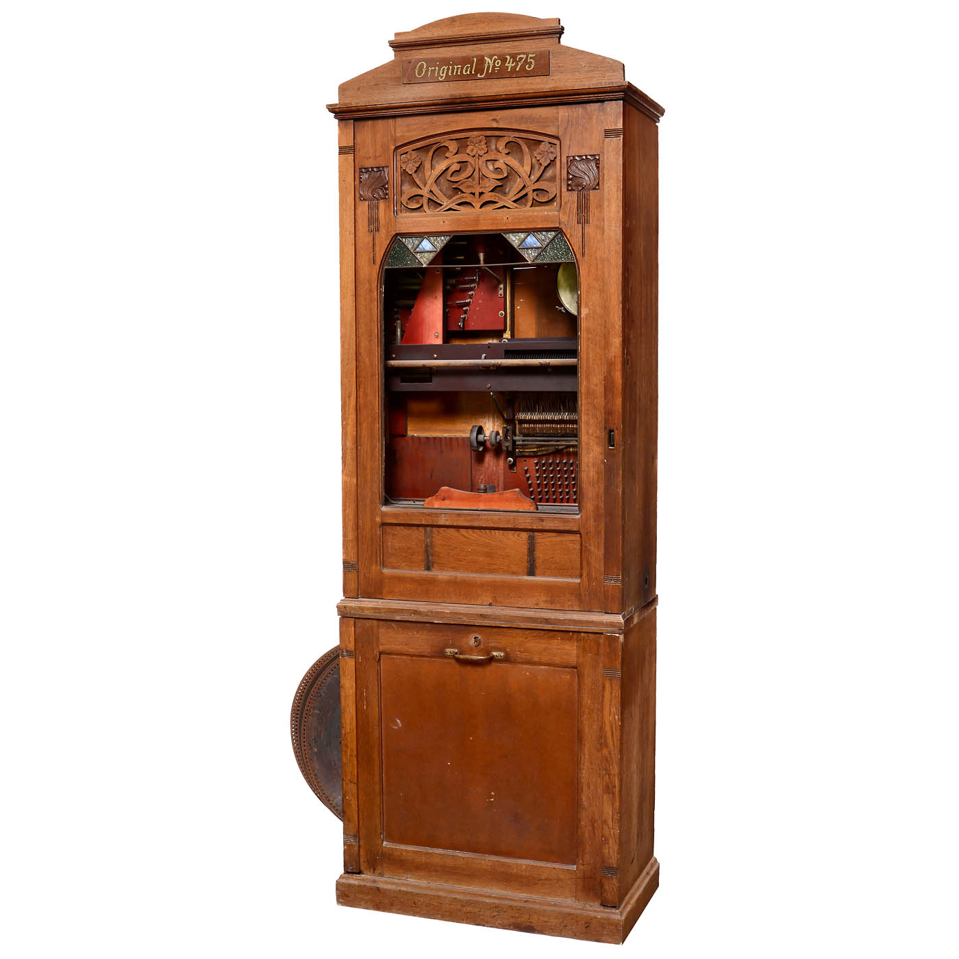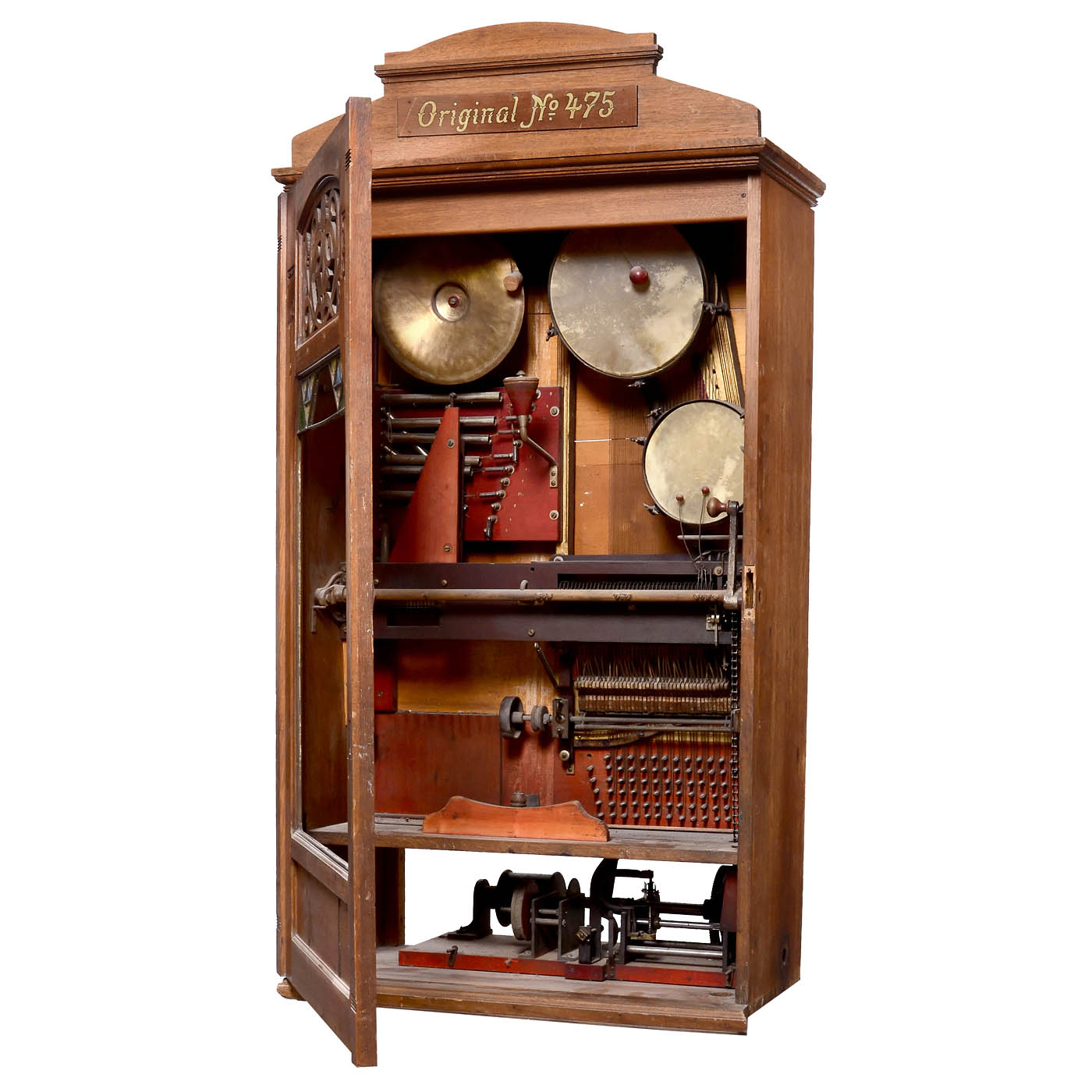 Original Musikwerke Paul Lochmann, Leipzig. For 26 in. discs, weight-driven, 36 piano notes, 12 tubular chimes (3 missing), percussion (cymbal, large and small drums), walnut case with base cabinet, overall size 31 x 16 x 92 in., with 20 discs with projections and 23 projectionless discs (mostly rusty). – Unrestored condition, door without glass panel, no weight, worthy of a restoration. – Literature: Bowers, "Encyclopedia of Automatic Musical Instruments", p. 114.
