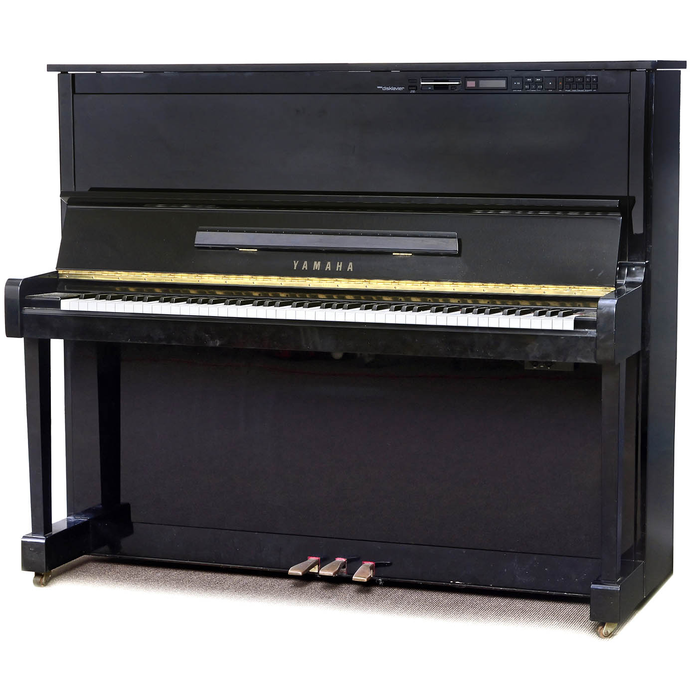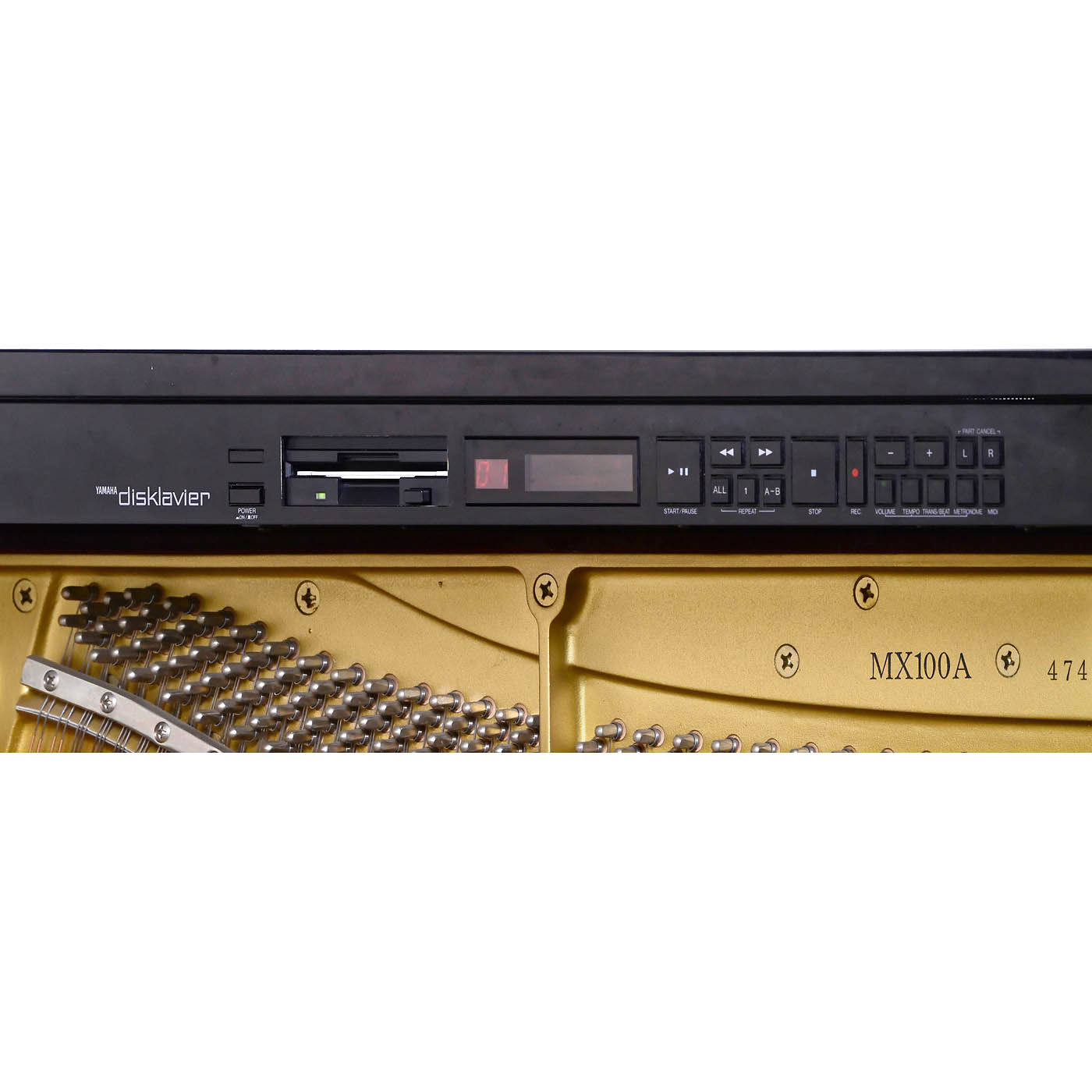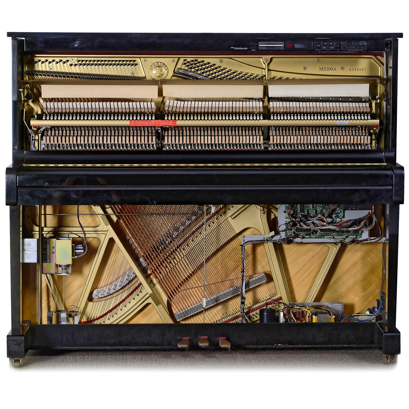 Model MX100A, a traditional acoustic piano with a built-in solenoid-based record-and-playback player system, keyboard and pedal sensors, control unit for 3.5-inch floppy disks, standard MIDI file format, with features including tempo control, transposition and connectivity to external MIDI devices, in Yamaha M1 upright piano with polished ebony finish. – Disk plays from beginning to end, title selection not possible, otherwise excellent playing condition! With 1 floppy disk with approx. 10 MIDI files.