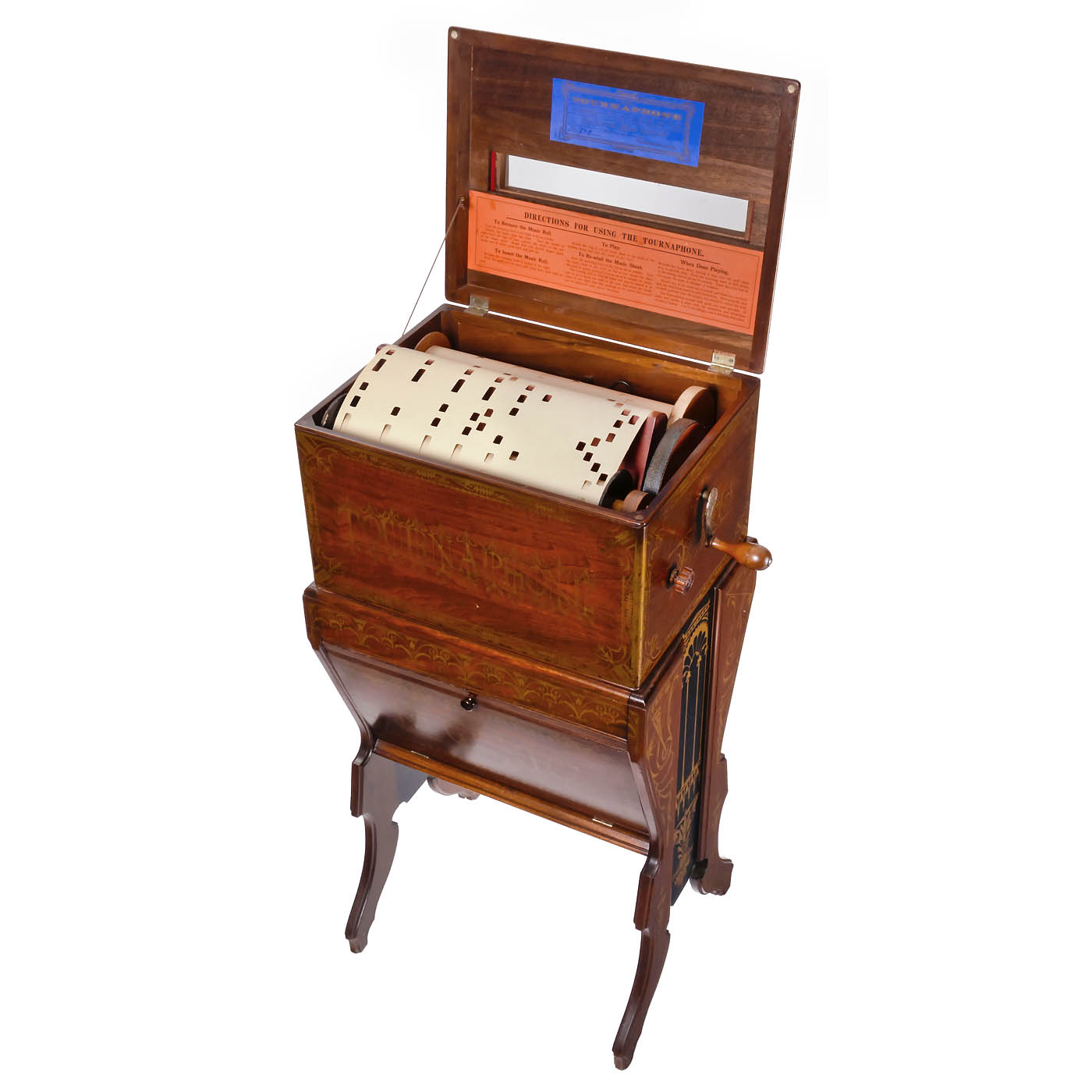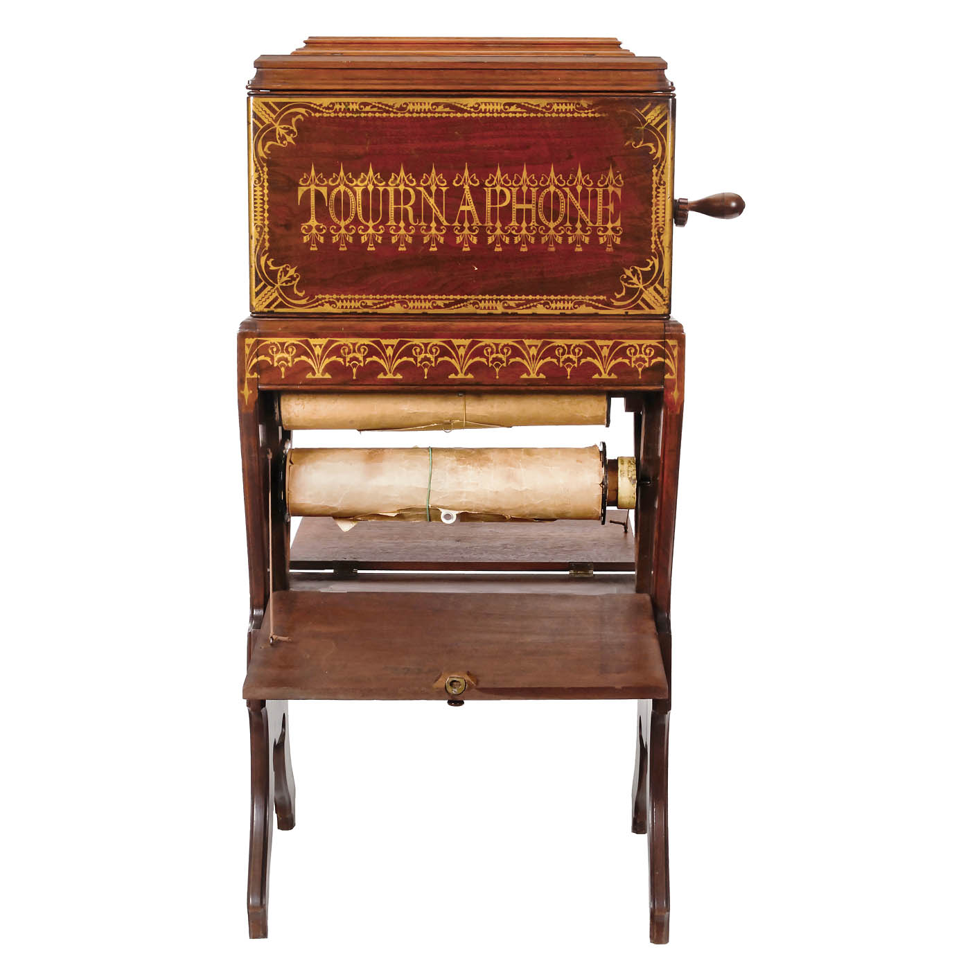 The Tournaphone Music Company, USA. 25 notes for 13 ¾ in. wide perforated paper rolls, wood case, exterior with excellent gilt stenciling, cupboard below the mechanism for storage of rolls, interior with instructions in lid, with 4 rolls, overall size: 17 ¾ x 14 1/5 x 38 ½ inches. – Provenance: Ex collection Jan Brauers.