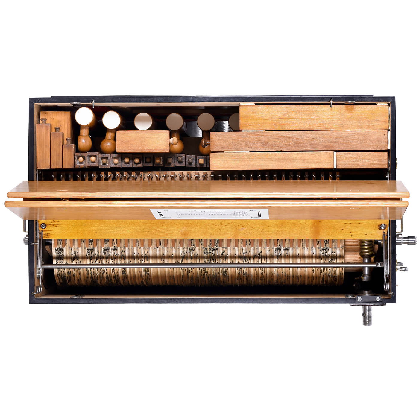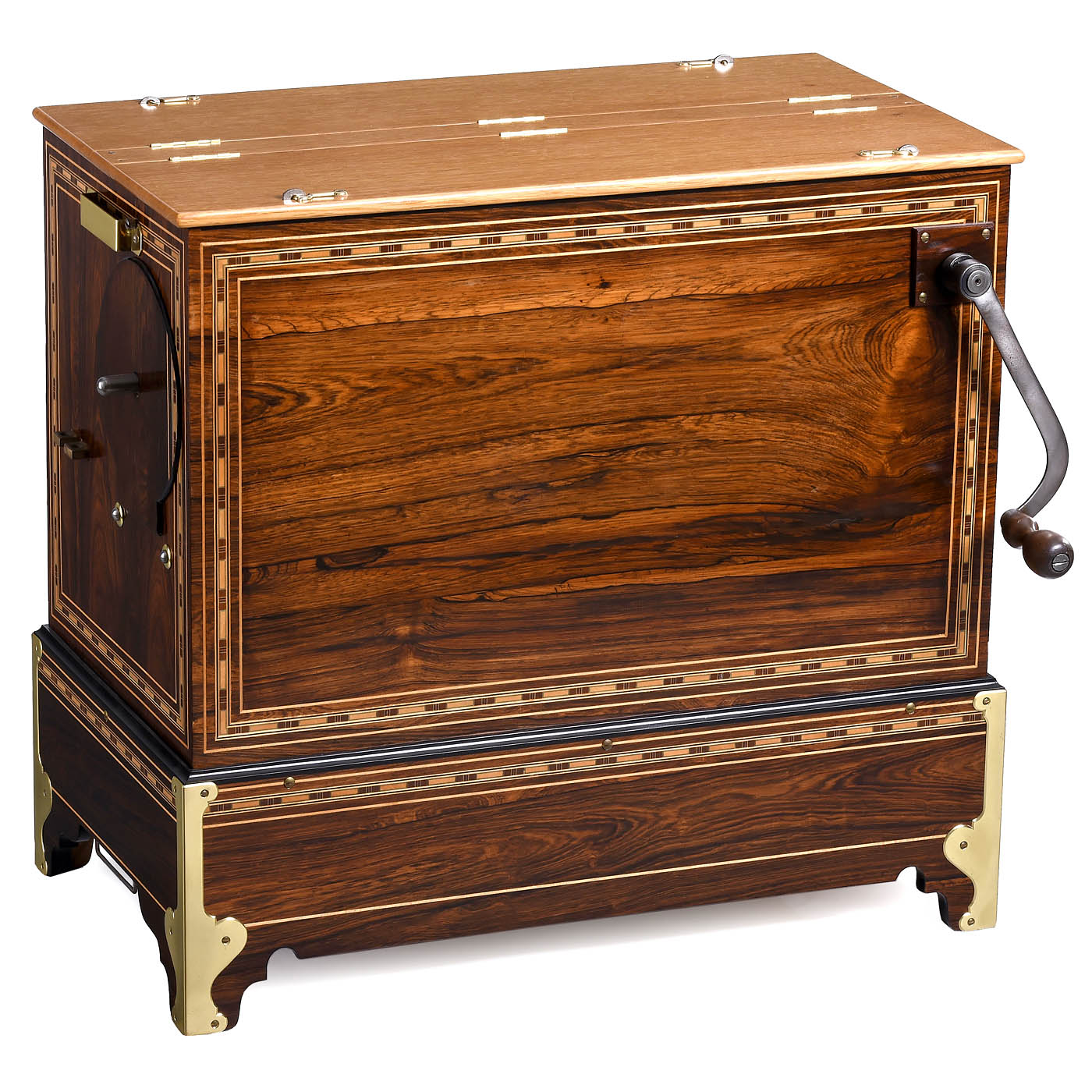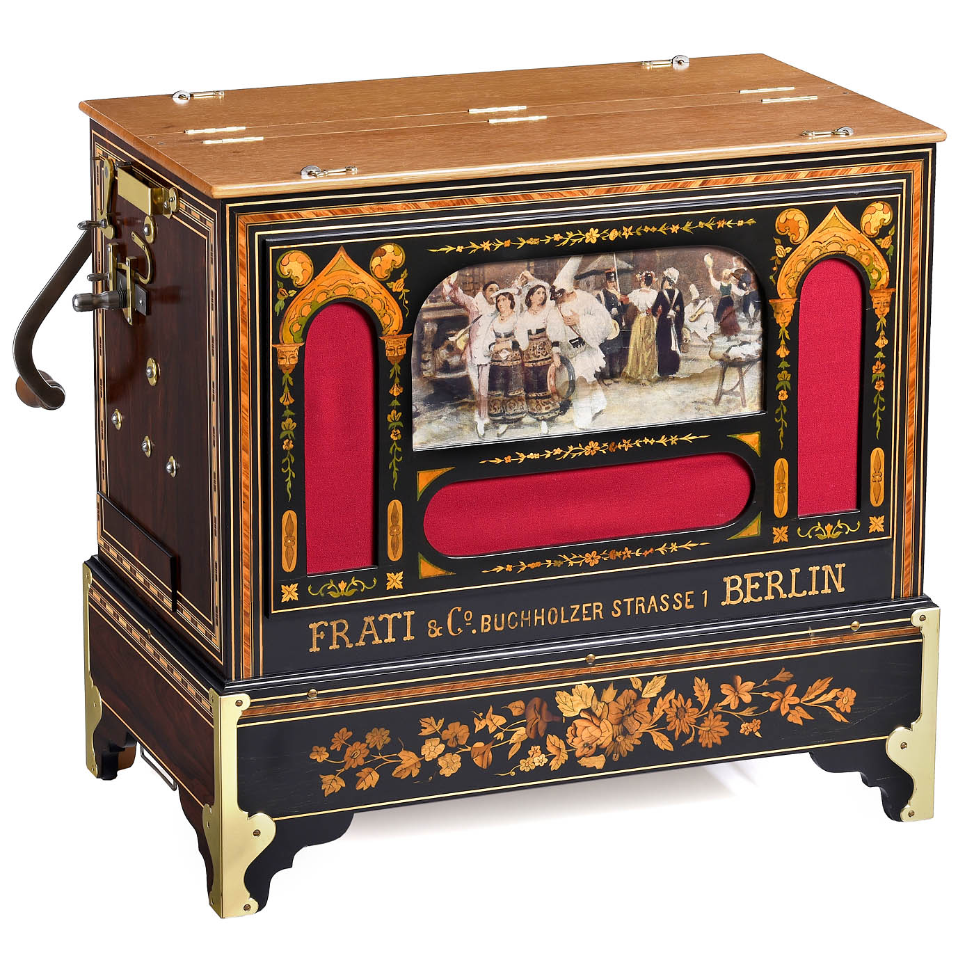 No. 133, pinned wood cylinder for 8 airs, 37 clavis, 3 ranks of pipes controlled by 2 stops, 10 trumpets, stopped pipes and bass pipes, in veneered and inlaid case with boxwood stringing and tulipwood banding, front with flower inlay and maker’s name: "Frati & Co., Buchholzer Strasse 1, Berlin", 25 x 14 x 22 in. – Excellent playing condition, restored by Wolfgang Hüttel!