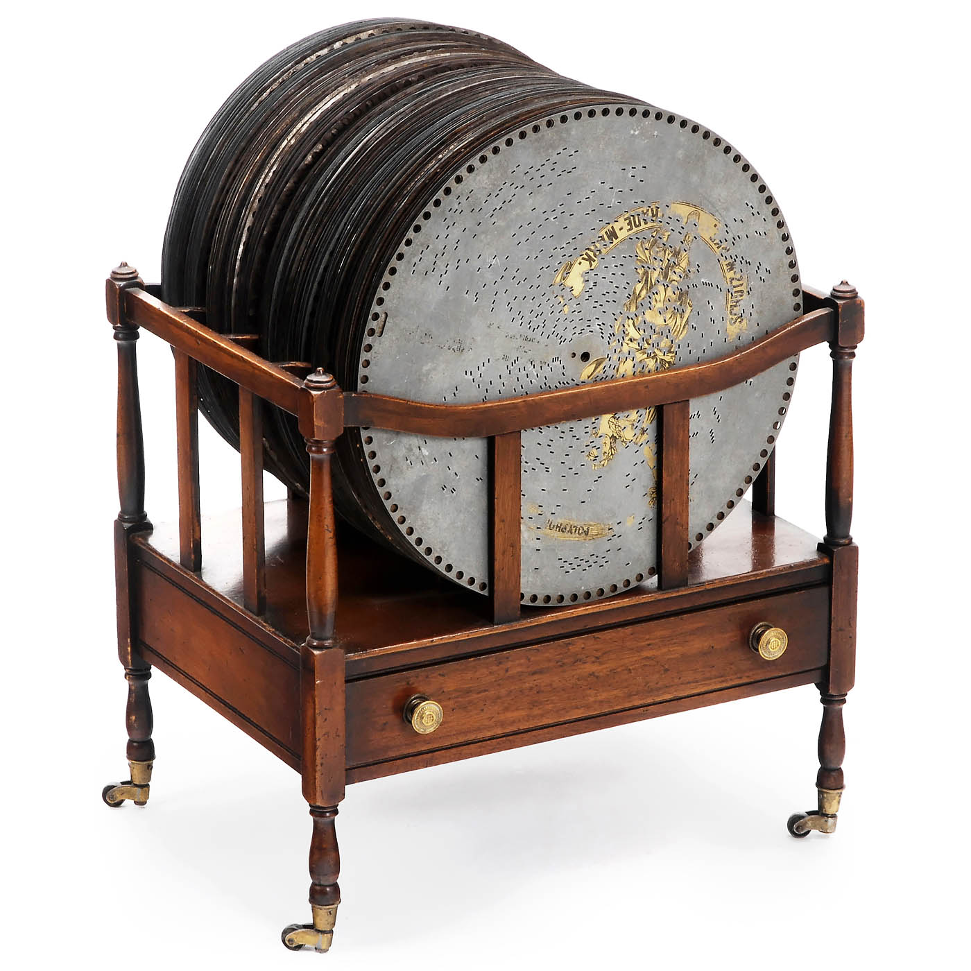 Polyphon Musikwerke, Leipzig. For discs of 15 3/4 in., 77 teeth in comb (1 broken), motor defective, case with damages, case refinished, attractive original lithograph in lid. With 110 discs (partially rusty). – In addition: Disc stand.