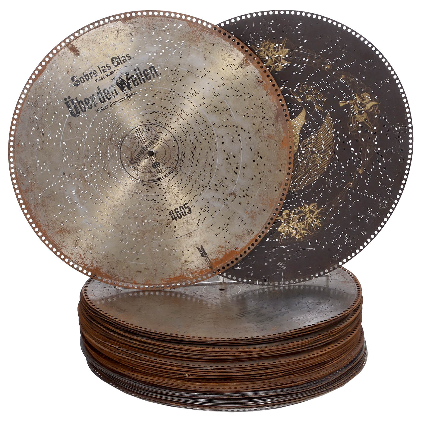 Symphonion Musikwerke, Leipzig. Some rusty, including 6 modern discs by Phoenix Music Box Company, England.
