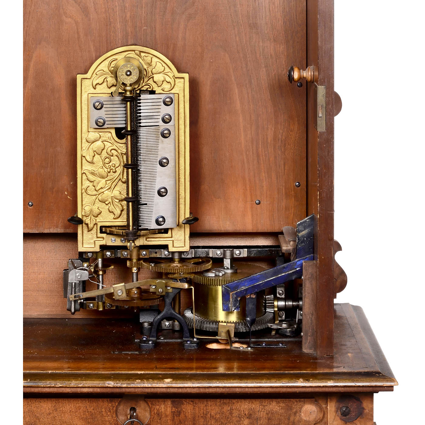 Leipziger Musikwerke Paul Ehrlich, Germany. With 78 teeth in three music combs (1 tooth broken), coin-operation, walnut case 28 x 14 1/5 x 36 3/4 in., door and drawer with lock and key, front glass panel with gilt lettering, two retailer's labels of "Carl Ruckmich, Freiburg", very good playing condition, with 19 discs. – Provenance: This musical box was operated in the restaurant of Josef Jäger in Freiburg and has been consigned by his family.