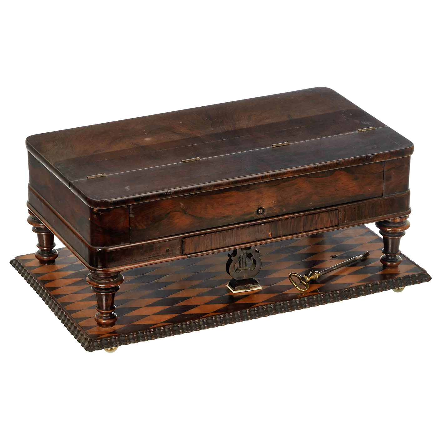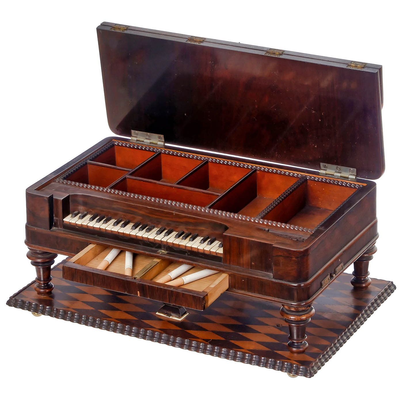 Veneered piano-form case with foot-pedal releasing cigarette-drawer and activating three-air musical movement by Mermod Frères, with bone simulated keyboard, sectional lid, fitted tray, tune-sheet, turned legs and marquetry base with rick-rack edging, base 15 x 9 in. (39 x 23 cm), good playing condition, with key. – Literature: Illustrated in Jan Brauers, "Von der Aeolsharfe zum Digitalspieler", p. 168.