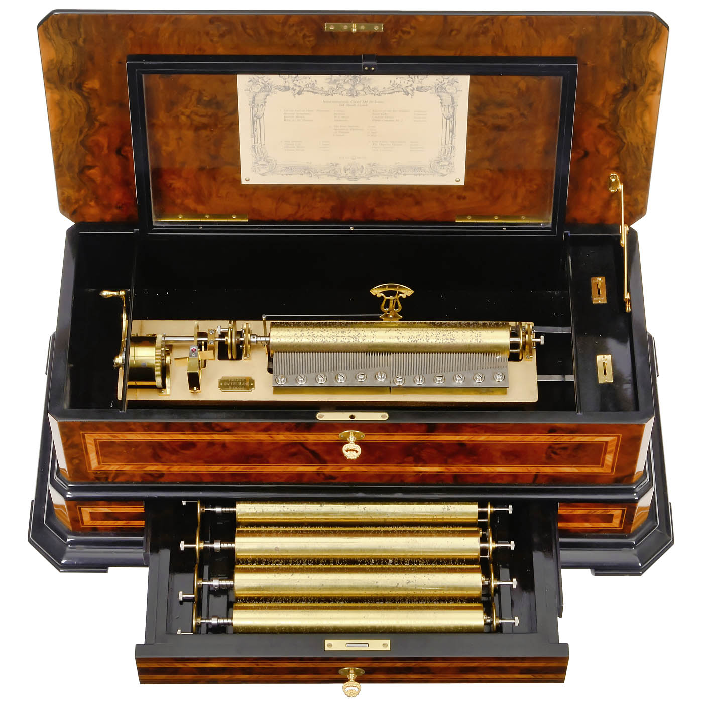 Ste. Croix, no. B.0033, with five cylinders playing four classical airs each, subline harmonie combs of 144 teeth in total (complete), tune-indicator, tune-sheet and traditional book-matched walnut-veneered case with tulipwood banding, storage drawer and matching table with tapering ebonized legs, wd. including table 36 in. (92 cm), cylinders 10 3/8 in. (26.5 cm), good playing condition, tune-changer mechanism in need of adjustment, some corrosion on cylinders, star-wheel of cylinder 5 corroded, a few surface scratches on table surface (largely covered by the musical box). – Note: The program includes works by Chopin, Beethoven, Strauss, Mozart, Rossini and Vivaldi. Cylinder 2 presents four works by Tchaikovsky. – A fine contemporary musical box.
