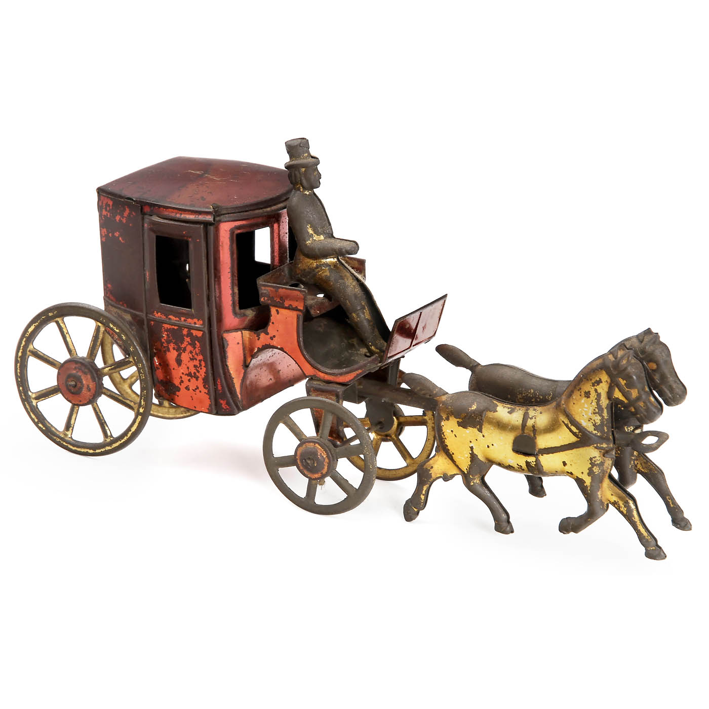 Unmarked, painted tin, 2 opening doors, coachman figure, length 6 in.