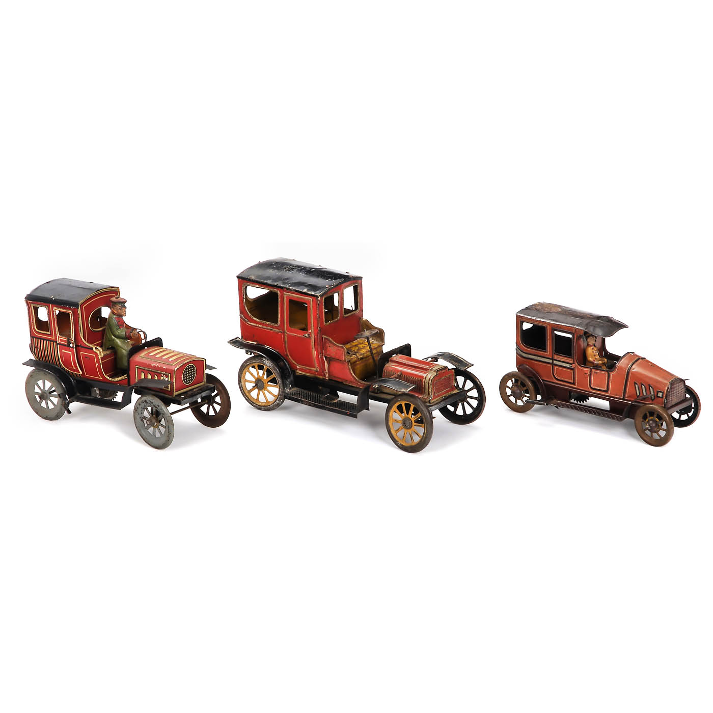 Germany, each unmarked, lithographed tin, spring-driven (all working), 2 with driver figures, 2 with doors to open, lengths 7 to 8 ¾ in., paint defects.