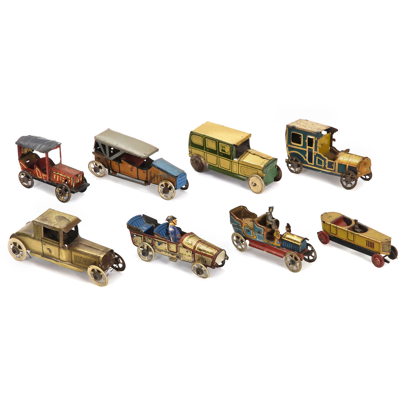 Lithographed tin. 1) CKO, Kellermann, no. 2016/56, open racing car with driver figure, length 3 1/6 in. – 2) Georg Fischer, no. 321, limousine with driver figure, length 4 1/3 in. – 3) CKO, Kellermann, no. 2016/29, limousine, driver figure missing, length 4 in. – 4) Meier, open limousine, without driver figure and passenger, length 3 1/6 in. – 5) FZ, no. 46, high roof tonneau, length 2 ¾ in. – 6) British Made, closed limousine, length 3 ½ in. – 7) Fischer, sedan, without driver figure, length 4 in. – And: 8) Meier, sedan car, roof shortened, length 3 ¼ in. – All cars with paint defects.