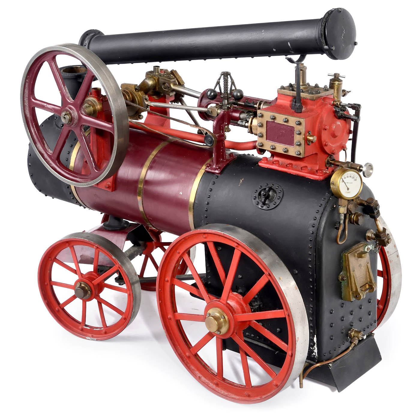 Working model of a British single-cylinder engine, polished-steel, cast-iron and brass construction, coal-fired, flame-tube boiler, Stephenson valve gear pressure indicator, water gauge level, feed pump, folding chimney, spoked wheels, front Ø 4 1/3 in., rear Ø 6 1/2 in., flywheel Ø 5 1/3 in., overall 16 x 7 ¼ x 22 1/3 in. – A detailed live-steam model with all its fixtures and fittings.