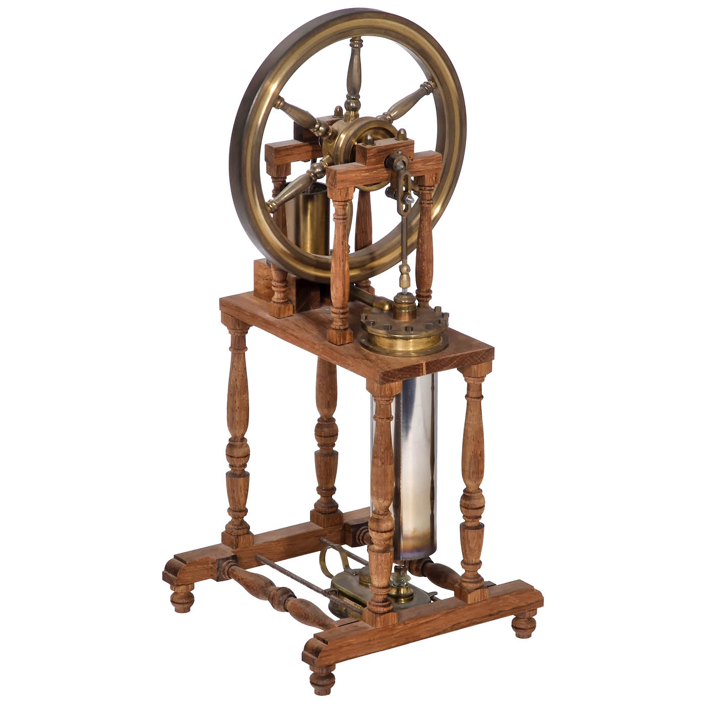 Working and displacement cylinder mounted separately, spirit burner, brass mechanism, wood frame with turned columns, flywheel Ø 5 ¾ in., height 13 1/3 in., works.