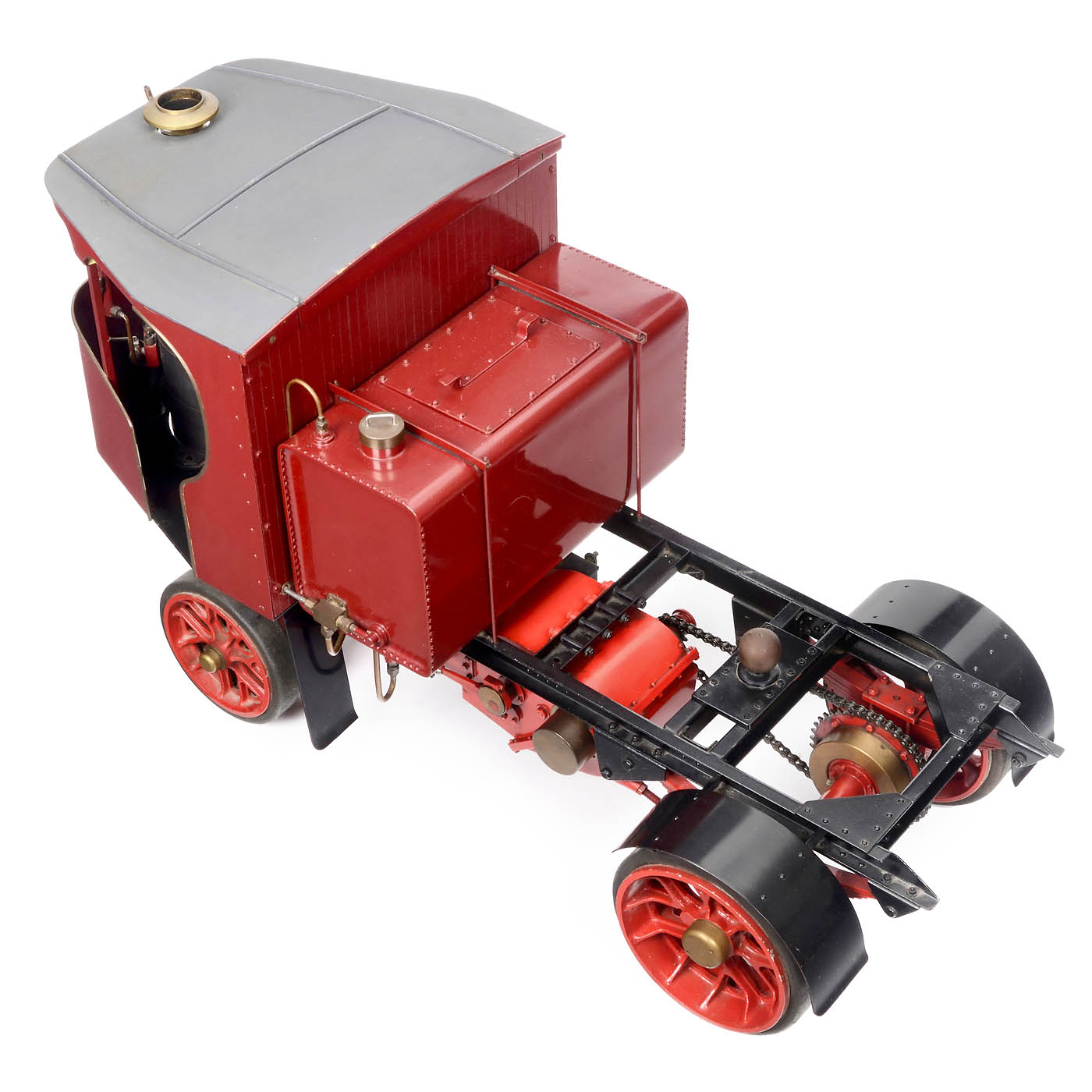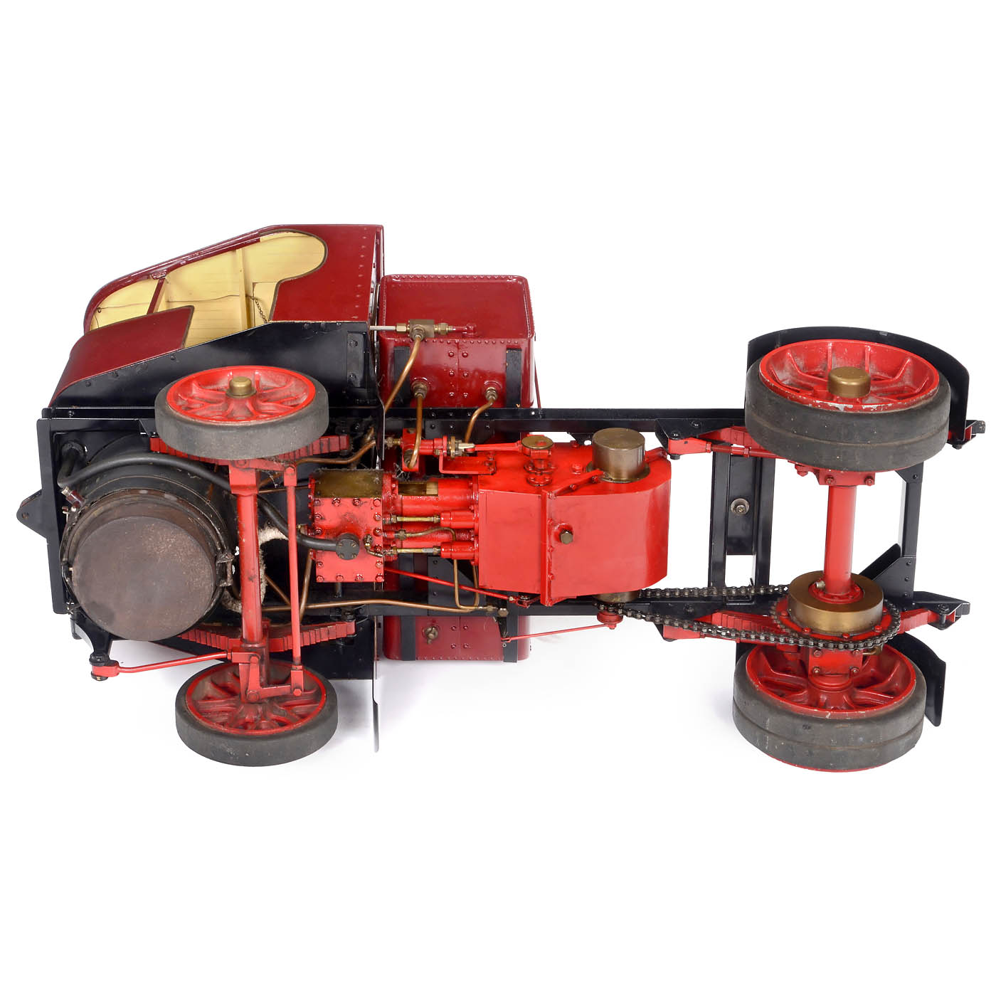 Cab with vertical coal-fired cast-iron boiler with water glass, pressure gauge, safety valves and chimney, large twin-cylinder engine with chain-drive to rear wheels, hand-operated gear lever, steering wheel, the rear with mounted water tank, chassis with leaf springs and four spoked wheels with solid rubber tyres, the front wheels steered via Ackerman linkage, finished in maroon, size 32 x 13 1/3 x 17 3/4 in. Complete, good condition, untested.