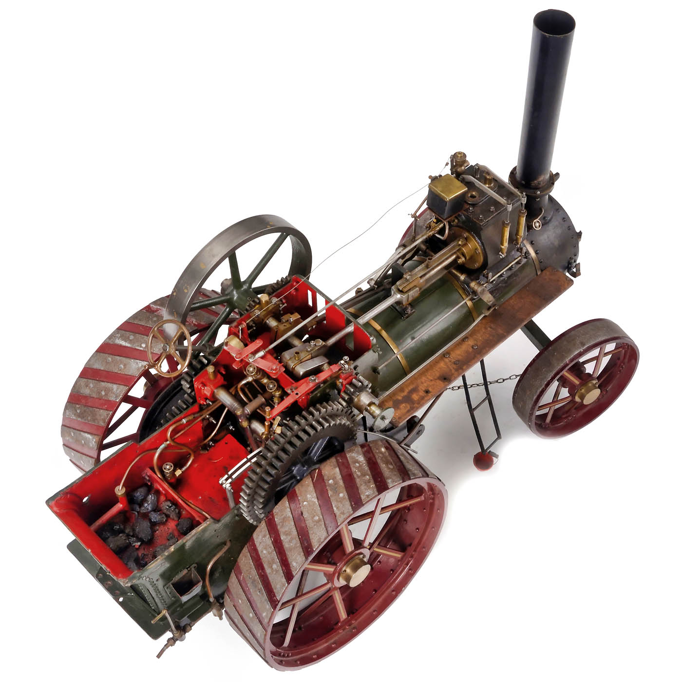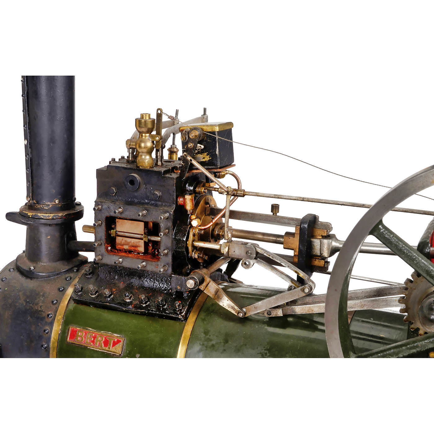 Large working model of the British "Bert" traction engine, coal-fired, single-cylinder engine, Stephenson's slide-valve gear, two-speed gearbox, flame-tube boiler, fusee-and-chain steering, reversible traction, rope winch, pressure indicator, water gauge level, feed pump, spoked wheels, front Ø 6 9/10 in., rear Ø 11 1/5 in., flywheel Ø 7 4/5 in., overall 30 1/3 x 15 x 22 1/2 in. – The model is not functional, the cylinder is partially disassembled and some parts are missing, nevertheless an impressive model, worthy of restoration.
