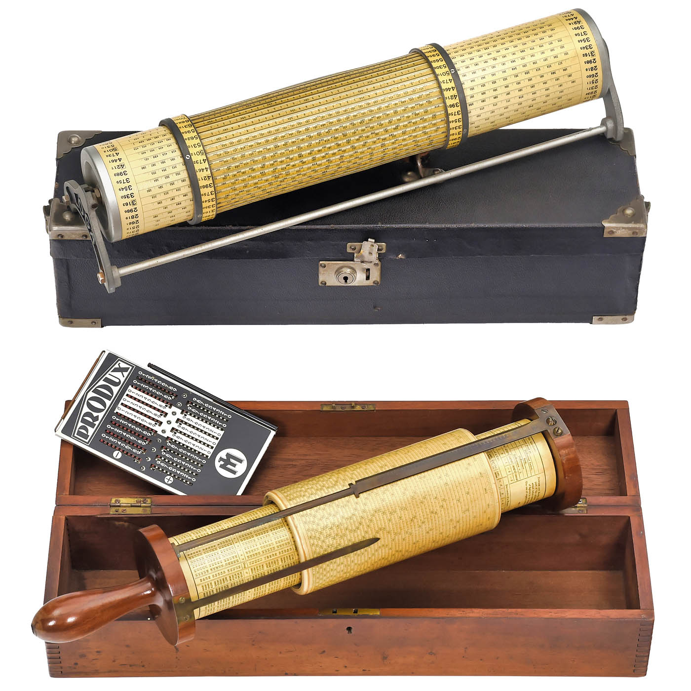 1) Professor Fuller's Spiral Slide Rule Calculator, 1889 onwards, made in England by Stanley, length of the barrel 11 ¾ in., with wood handle, in mahogany case. - And: 2) Calculator Loga, 17 in. wide, made by Daemen, Schmidt & Co., Zurich, Switzerland, rotating on cast-metal stand. - In addition: Rack adder "Produx"