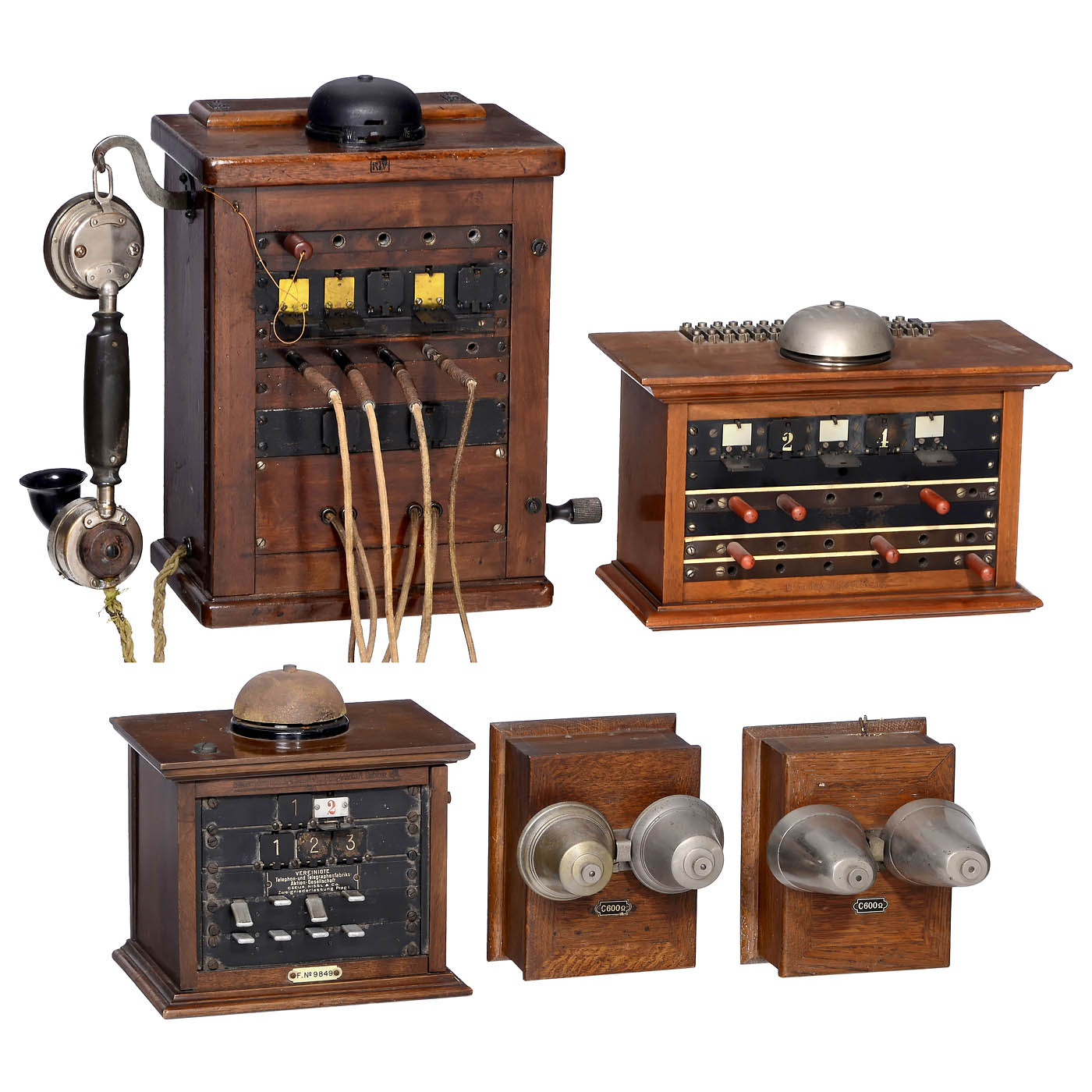1) Telephone switchboard model 05, c. 1910, for telephone systems with 5 double lines, polished walnut case, 7 flaps and 3 plugs, 3-lamella crank inductor, DC alarm clock with change-over switch, handset ZB 06 with loud-listening button and speaking horn, with lock and key. - 2) Switchboard, Vereinigte Telephon- und Telegraphenfabriks-Aktien-Gesellschaft Czeija, Nissl & Co., Prague, 5 flaps, 8 switches. - 3) 2 telephone double bells, 600 ohms each. - And: 4) Switchboard, Deutsche Telephon Werke Robert Stock & Co, 6 flaps, plug-in board, single bell, walnut case.