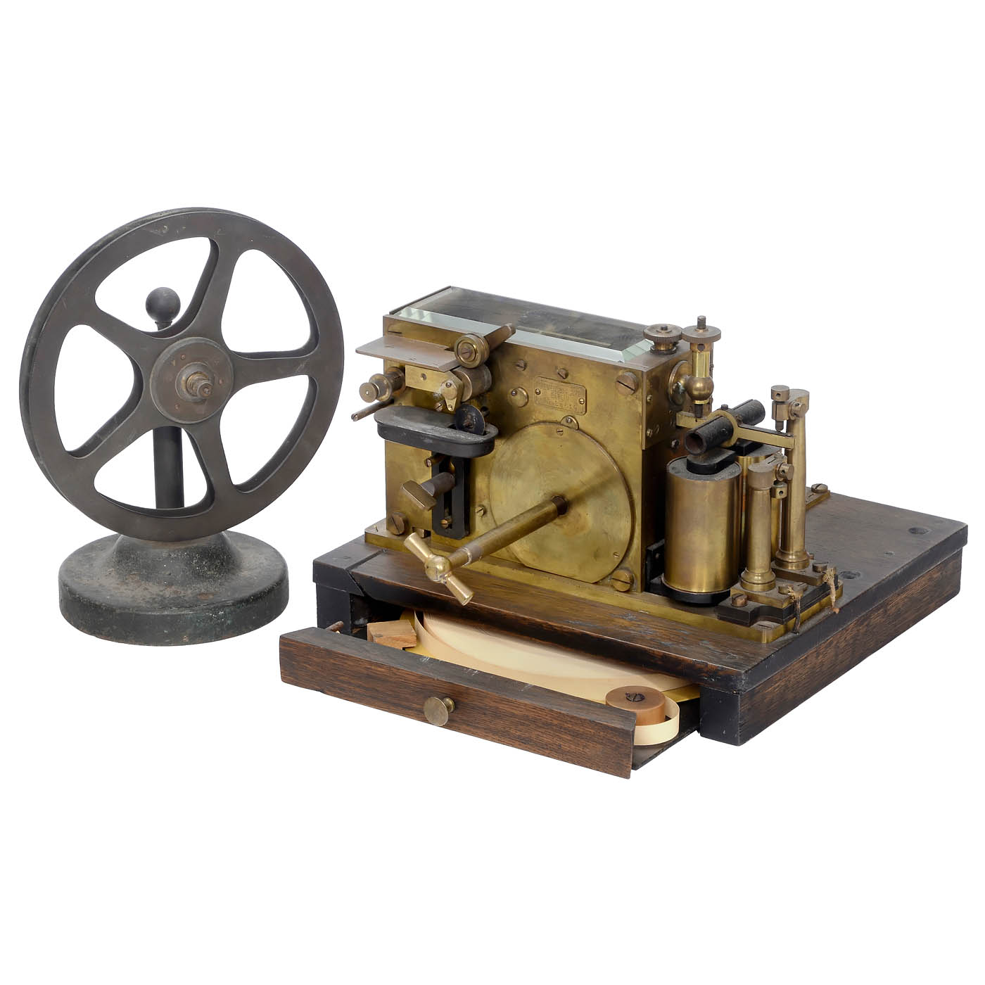 Berlin, ink writer, no. 34619, brass, spring-drive, drawer with paper strip in plinth base, 6 screw terminals, size 10 x 11 in., the motor of the device switches on automatically when a signal is received and switches off as soon as no further signals are received, working, with separate coil.