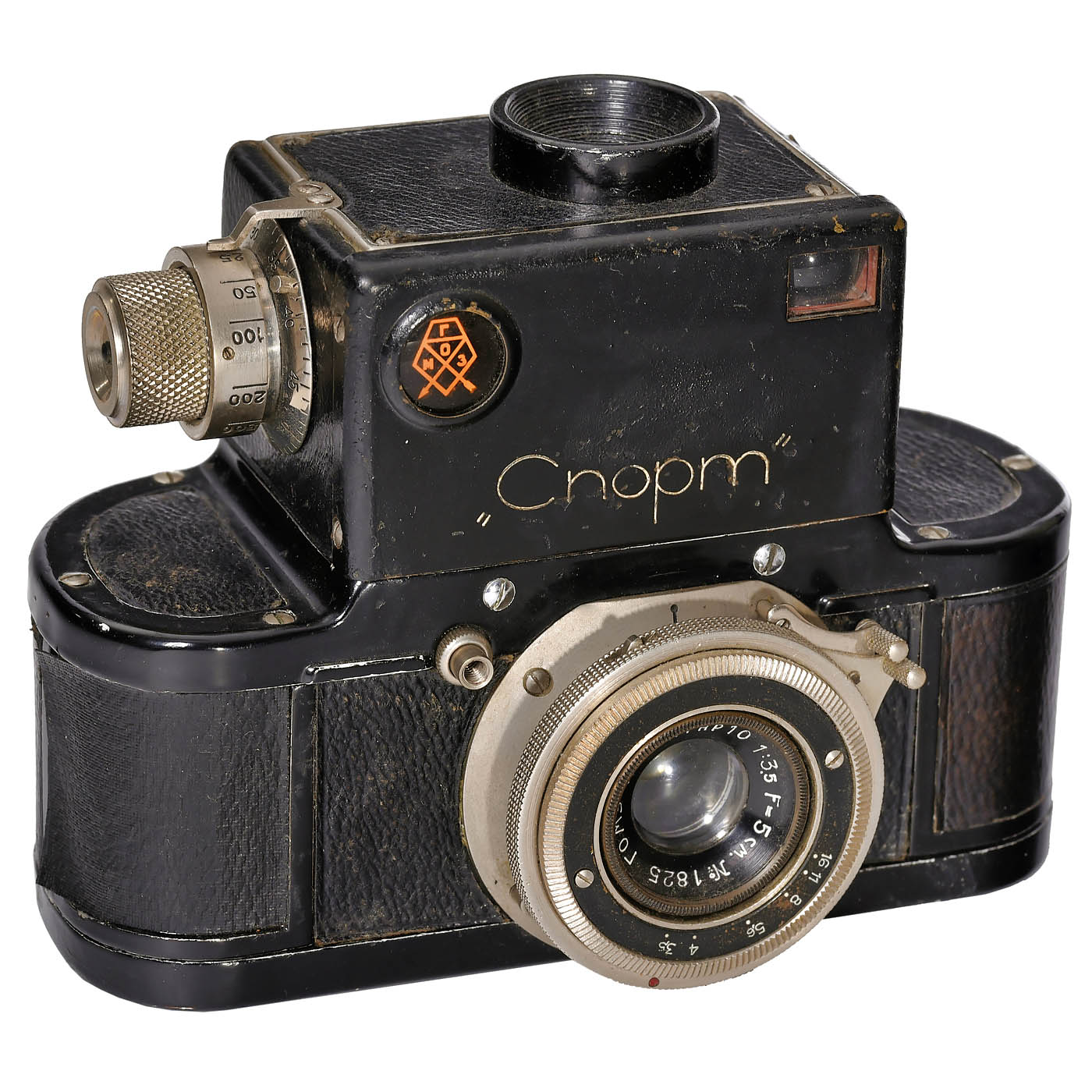 GOMZ, Leningrad, USSR. Exterior unnumbered, internal No. 728, SLR camera for 24 x 36 mm, shutter 1/25-1/500 seconds, Industar-10 3,5/5 cm, no. 4961, white aperture scale and one spool, shutter working, in comparatively good condition for this model. - A legendary camera, the second 35mm SLR after the Ihagee Kine-Exakta.