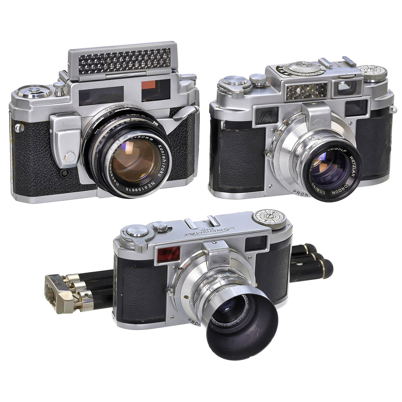 1) Leidorf, Wetzlar. Lordomat C 35, no. 123804, c. 1956, with interchangeable Lordon 1.9/50 mm, clean glasses, exposure meter not working, shutter: long times stuck. (3+/3-) - 2) Lordomat no. 55330, c. 1953, with Lordonar 2.8/50 mm, rangefinder field slightly faded, with original Lordomat metal lens hood. (3/3) - And: 3) Konishiroku, Japan. Konica III M, no. 405223 with Hexanon 1.8/50 mm, c. 1959, light meter not working. Rarely found in Europe. High-quality camera that creates a slight "Leica feeling"! (2-/3) - In addition: small tripod.
