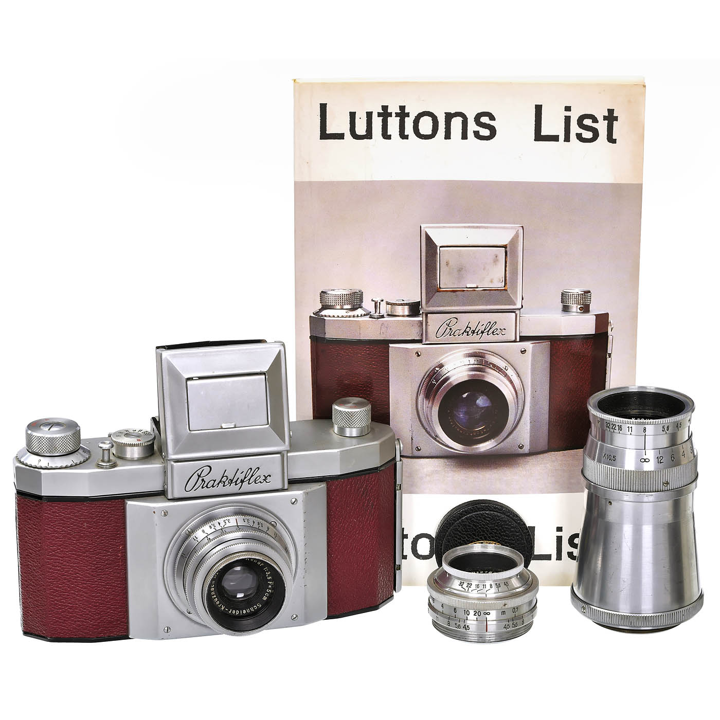 1) K.W. (Camera workshops Guthe & Thorsch), Dresden. No. 3343, lens connection ring with M40 thread, chrome housing with original wine-red leather covering and Schneider Xenar 3.5/5 cm no. 1637871, good working condition - rare color variant of an early Praktiflex camera. - 2) Tele lens in M40 connection: Schneider Kreuznach Xenar 4.5/10.5 cm no. 1707717, solid construction and rare to find, clean glass. - 3) Wide-angle lens in M40 connection: Zeiss Tessar 4.5/4 cm no. 2784759 with original leather cap, rare to find. - And: 4) Lutton 1992 - Lutton’s List, "The 35 mm SLR 1935-1954", 104 pages.