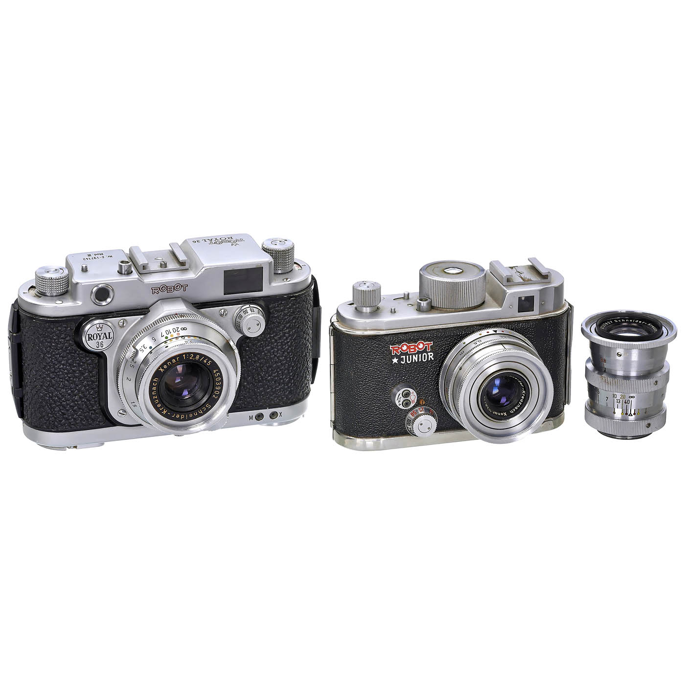 Berning, Düsseldorf. 1) Robot Royal 36 Mod. III, no. Z-137142, c. 1955. With Schneider Xenar 2.8/45 mm, clockwork drive works, shutter from 1/8 sec., sluggish, with NR cassette. (3/3) - 2) Robot Junior, no. J 148207, c. 1954. With Schneider Xenar 2.8/38 mm. Clockwork drive works, with N cassette and case. (3-/3) - And: 3) Schneider Tele-Xenar 3.8/75 mm no. 2127827, screw-mount, with original leather case. (3/3)