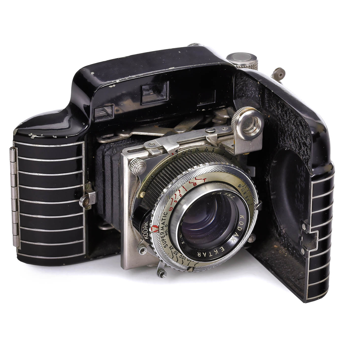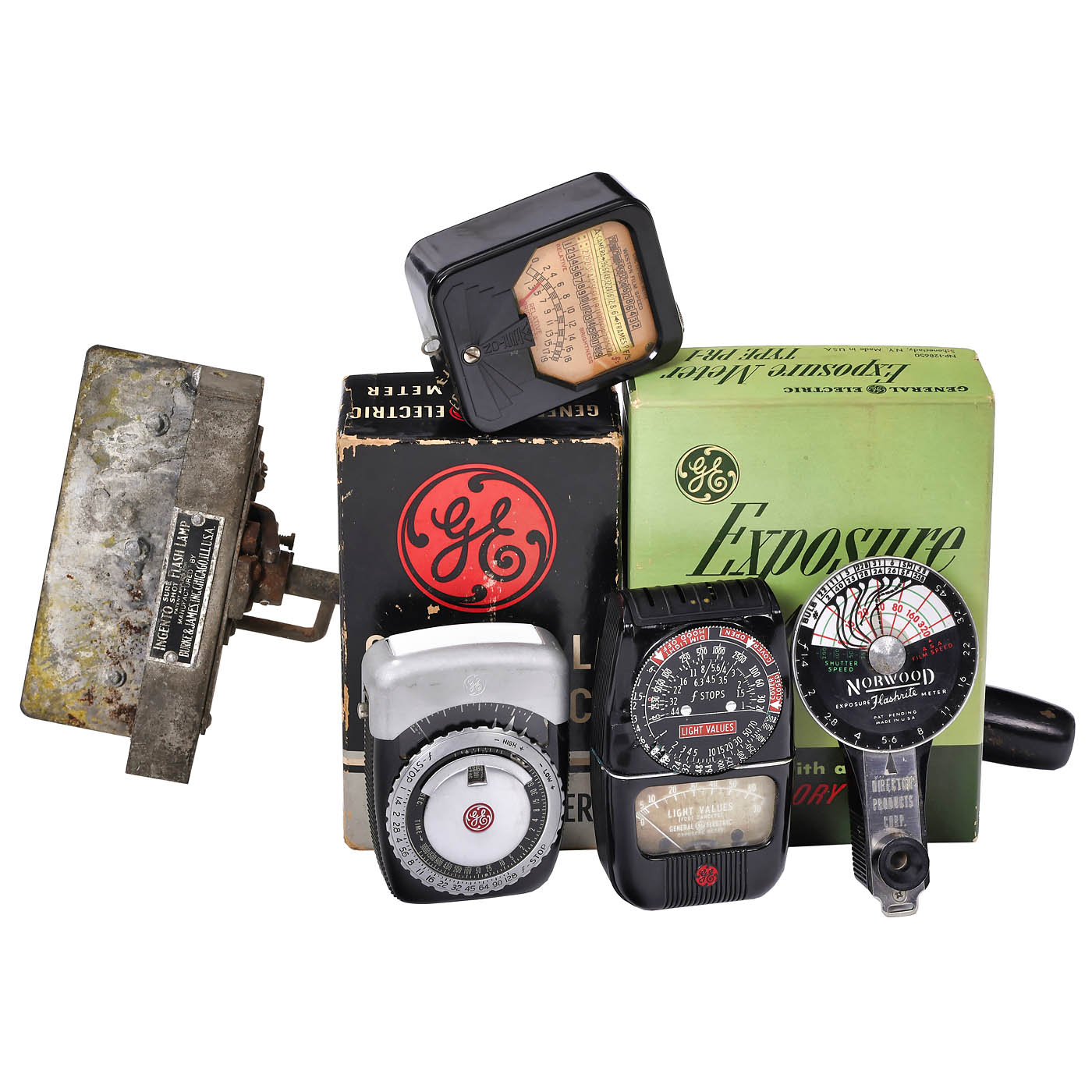 1) Kodak, Rochester, N.Y. Bantam no. 25321, 28 x 40 mm for 828 film, Art-Deco style, with Kodak Ektar 2/45 mm in the rare Supermatic shutter, good condition. (3/3) - 2) General Electric, USA. Exposure Meter Type PR-1, with diffuser, instructions and box. (3/-) - 3) General Electric. Type DW-48, with box and instructions, working. (3-/3) - 4) Weston Elec., USA, Weston Model 850, rubber band sticks, but measuring cell working. (3/3-) - 5) Norwood Exposure Flashrite Meter, rangefinder used to calculate flashbulb size. - And: 6) Burke & James, USA. Ingento Sure Shot Flash Lamp, flash powder-holder. (4-/-)