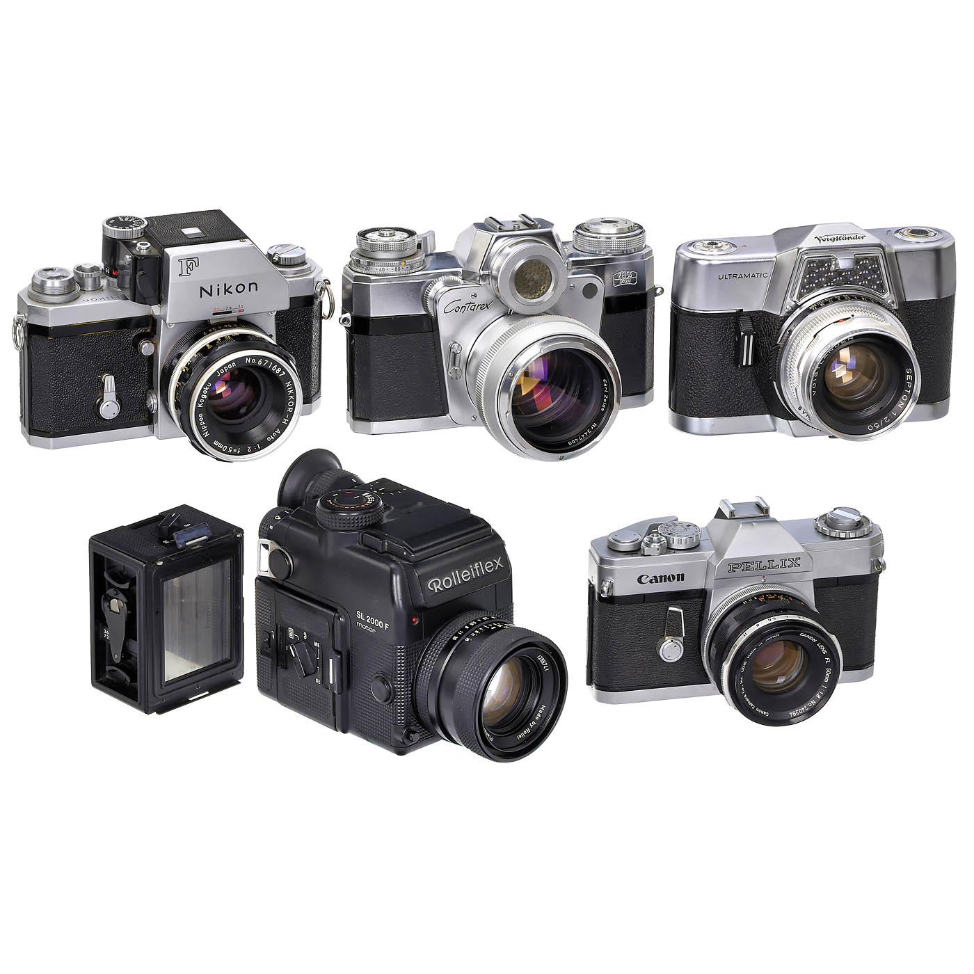 1) Canon, Japan. Pellix, no. 137429, c. 1964, built-in fixed splitter mirror, with FL 1.8/50 mm. (3/3) - 2) Nippon Kogaku, Japan. Nikon Photomic Ftn, no. 6825484, c. 1969, with Nikkor-H 2/50 mm, clean glass, back overpainted, numbered note scratched on the edge of the prism attachment. (3-/3) - 3) Rollei, Brunswick. Rolleiflex SL 2000F, no. 824270019, c. 1982, with Planar 1.8/50 mm and additional magazine, electronics untested, otherwise apparently unused and in good condition. (2-/-) - 4) Voigtländer, Brunswick. Ultramatic, no. 14360, c. 1962, with Septon 2/50 mm, camera appears unused. (2/-) - And: 5) Zeiss Ikon, Stuttgart. Contarex 'Bull's Eye', no. D 21974, 1959 onwards, with Planar 1.4/55 mm, optics in good condition, swing-back mirror can stick, otherwise (3/3)