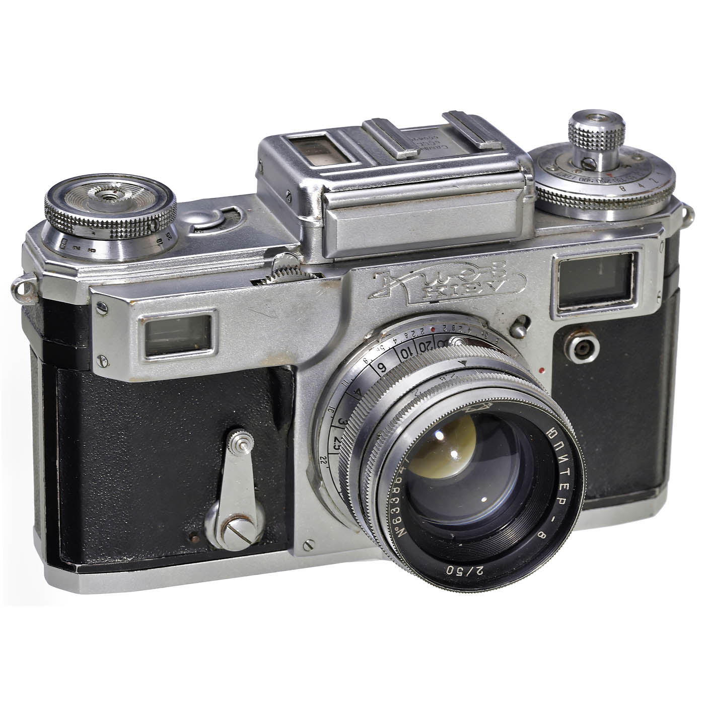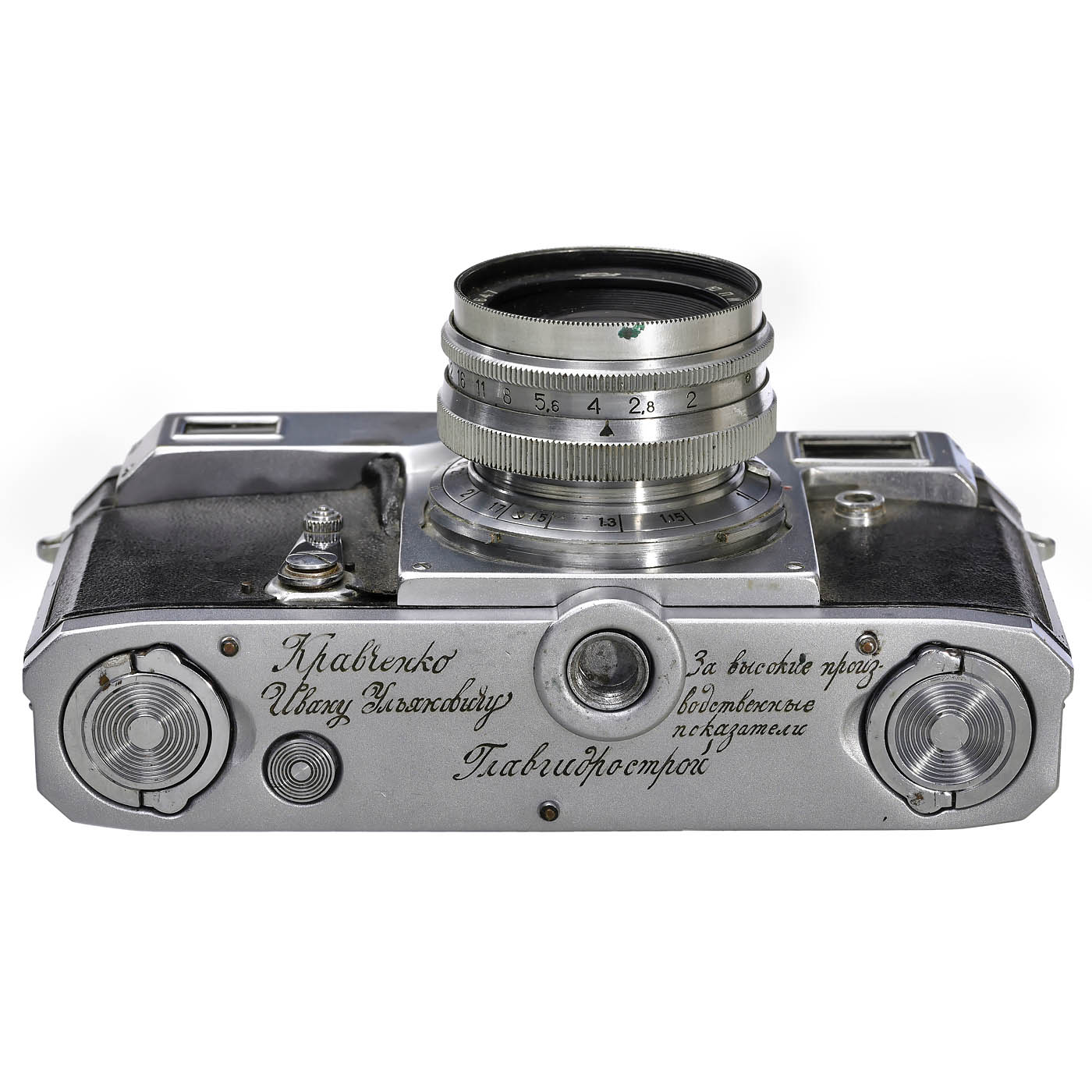 Kiev Arsenal, Ukraine. Contax replica no. 6004902, with Jupiter 8 2/50 mm lens and engraved dedication on the baseplate, with case, shutter, light meter and distance measurement working.