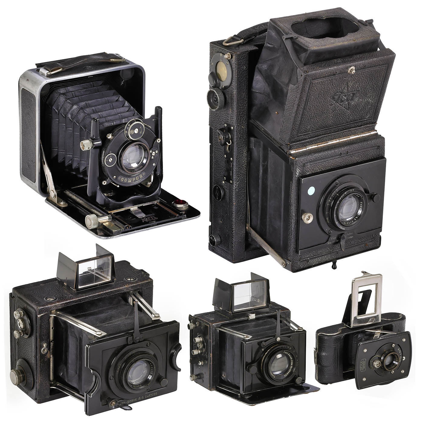 1) Kern, Aarau, Switzerland. Bijou, folding camera for 6.5 x 9 cm, double-extension, Kern Lens 4,5/105 mm no. 1135, Compur working, focusing screen back probably replaced. A rare camera! (3/3) - 2) ICA, Dresden. Klappreflex type 754, no. J 86761, for 6.5 x 9 cm, with focusing screen back, Zeiss Tessar 4.5/12 cm lens, mirror without reflex coating, shutter sticking. (3/4) - 3) Ernemann, Dresden, Miniatur-Klapp, for 4.5 x 6 cm, with focusing screen back, a Zeiss Tessar 3.5/7.5 cm lens, 9 cassettes and case, shutter slow. (3/3) - 4) Ernemann. Klappkamera, no. 799946, for 6.5 x 9 cm, with original Zeiss Ikon focusing screen back and a Zeiss Tessar 4.5/12 cm lens, shutter partially working. (3-/4) - And: 5) Zeiss Ikon. Bobette I 549, no. O 17030, for 2 x 3 cm on 127-rollfilm, with an Ernoplast 4,5/7,5 cm, shutter working, in good condition. (3/3)