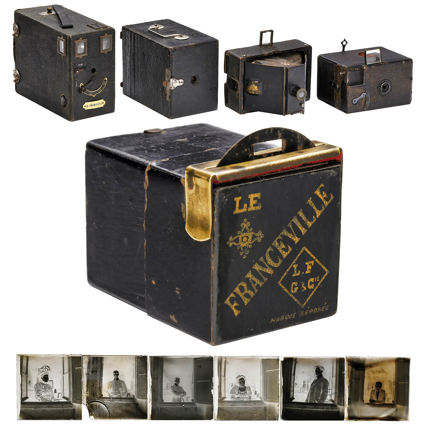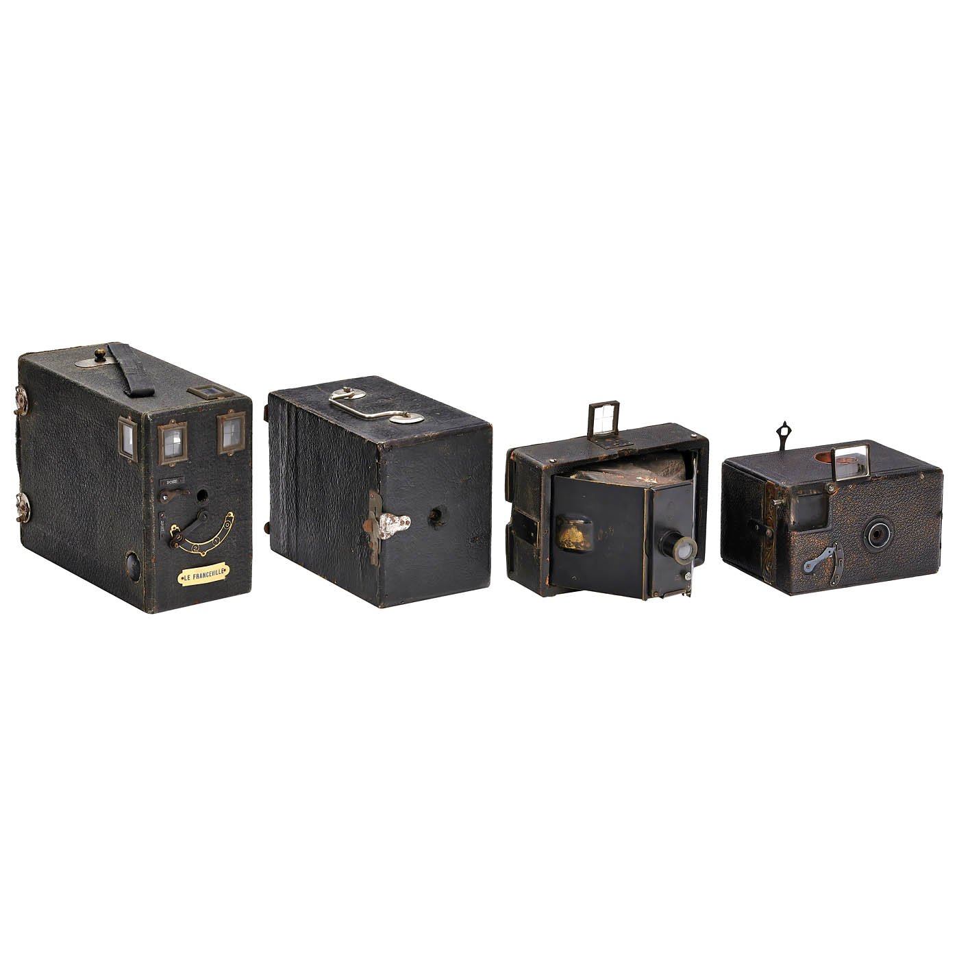 1) Japy Frères & Co., France. No. 10257, for 4 cm wide rollfilm with 12 exposures of 40 x 55 mm, spring motor with winding via film transport, meniscus lens, film counter, leather-covered metal / wood housing with brass fittings, sector shutter LPR working (with assistance), clockwork motor not working. The first spring-driven rollfilm camera, rare and a milestone in camera technology. - Literature: Michel Auer, "Cameras Yesterday and Today", p. 129. (3-/3-) - 2) J. Fetter, Paris. Fetter folding camera, c. 1910, for 6 x 9 cm, shutter working, lock and other small internal parts missing on back. (4/4) - 3) Guiot & Cie, Le Franceville, box camera, c. 1908, for single plates of 4 x 4 cm, meniscus optics, with inset cassette, Jougla plate box with 8 negatives (six exposures) and copying frame. (4/-) - 4) "Le Franceville" magazine camera, c. 1910, for 6 x 9 cm, with 6 inserts. (3-/4) - And: 5) L'Epatant card box camera, c. 1905, for single plate of 6 x 8 cm, with gilt name on the reverse. This previously unrecorded model is usually found with 45 x 45 mm plates. (4/4)