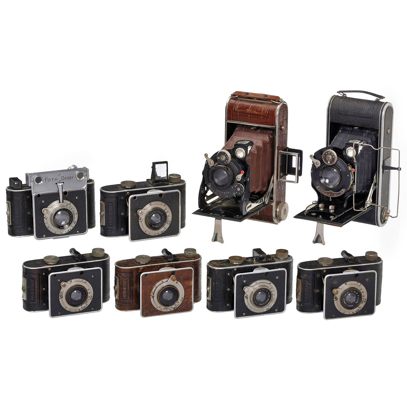 Foth, Berlin, rollfilm. 1) Derby Luxus, brown leather, 24 x 36 mm, shutter with 1/250 sec. instead of 1/200, 3.5/50 mm, retailer’s plate "Bater, Warzawa" on the back. (3/3) - 2) Derby 24 x 36 mm, 3.5/50 mm, Newton viewfinder. (3/3) - 3) Derby 24 x 36 mm, folding viewfinder. (3/3) - 4) Derby 24 x 36 mm, folding viewfinder, back with rings around counting window. (3-/3-) - 5) Derby with rangefinder, 3 x 4 cm, 2.5/50 mm no. 70615, feet engraving, with cap. (3+/3) - 6) Derby II 3 x 4 cm, 3.5/50 mm no. 86614, with decorative original box. (3-/3) - 7-9) Derby II German export version, feet scale, 3 x 4 cm, 3.5/50 mm no. 69124, 2.5/50 mm 63336 and 58186. (3-/4) - 10-11) Derby II, 3 x 4 cm, 2.5/50 mm and 3.5/50 mm. (3/3) - 12) Springfoth Luxus Mod. B, 6 x 9 cm, brown leather-covered body, brown bellows, Foth Anastigmat 4.5/105 mm, shutter with self-timer up to 7 seconds, in original box. (3+/3) - 13) Foth model 1930 for 6 x 9 cm. (2-/3) - And: 14) Foth binocular prism binocular 8x no. 37206, sharp, clear image. A prism binocular of great rarity. (3/2)